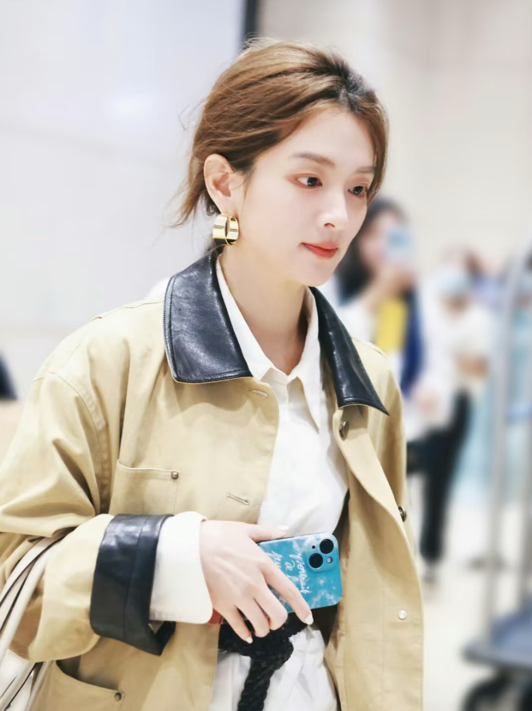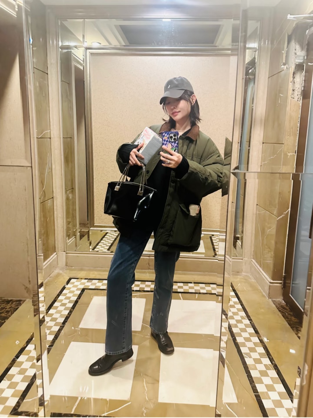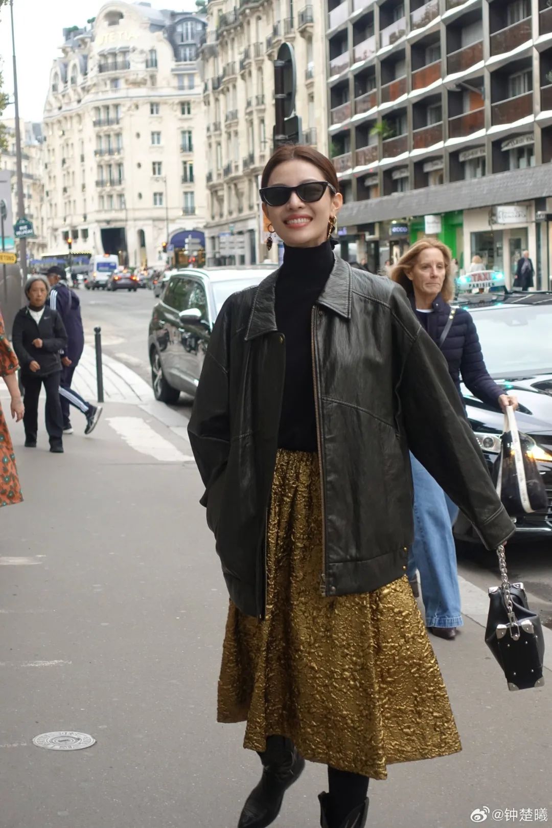钟楚曦的私服也能看到“巴恩风”穿搭,比如工装风的皮夹克搭配半裙,金属色和压花让裙身看起来很挺括厚实,即便是裙装也不影响气场输出。