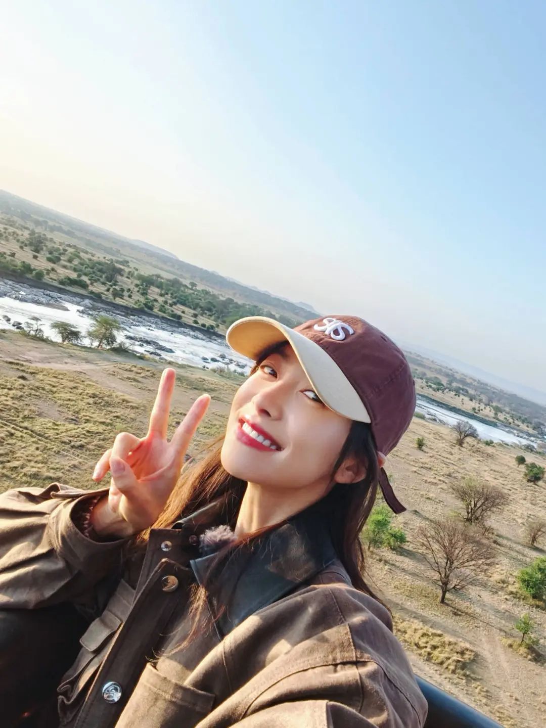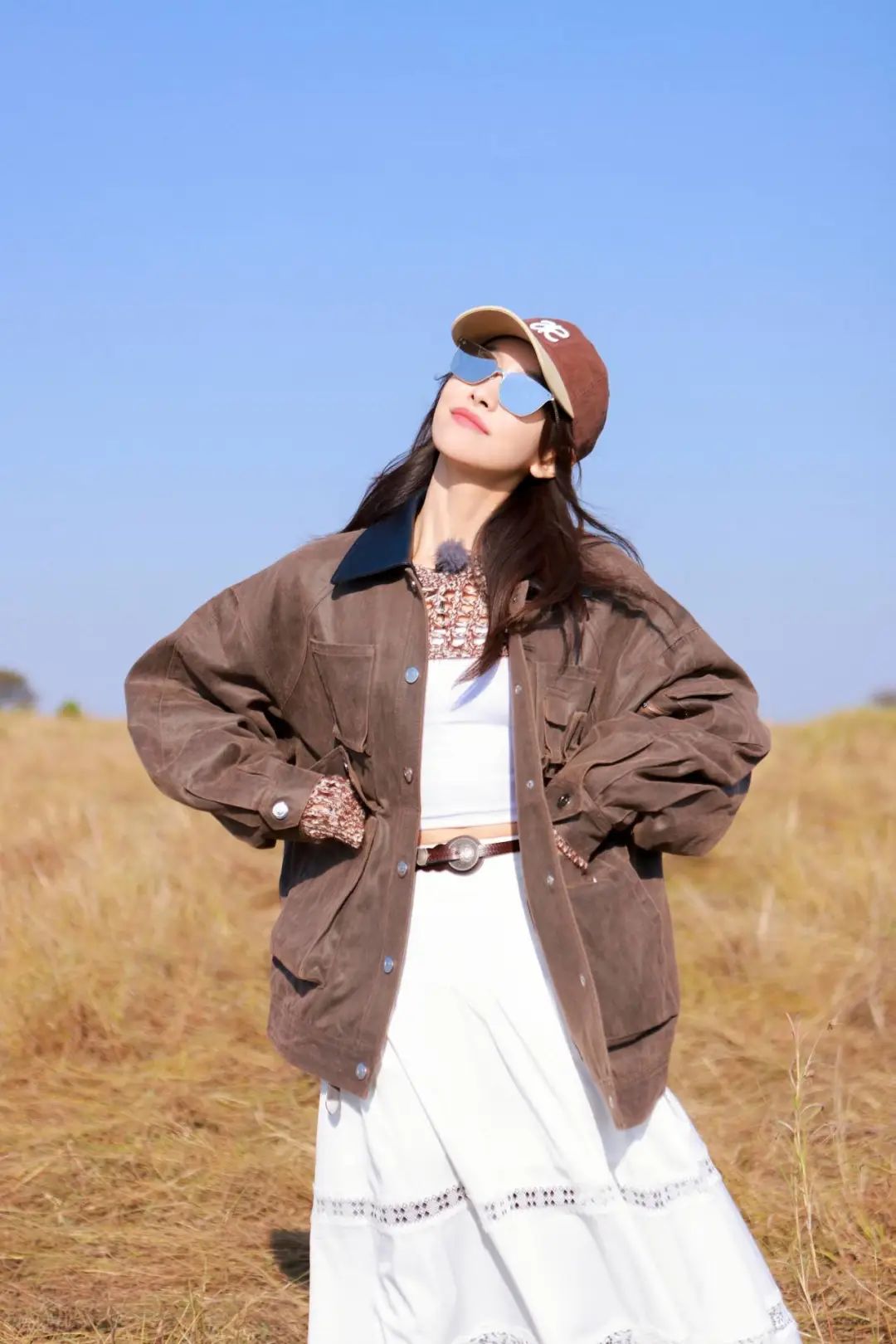 宋茜在《花少》非洲大草原的旅行中,这身棕色麂皮工装外套搭配小白裙,既贴合草原的粗犷感,又不失清新感,整体造型不会显得很厚重、沉闷。