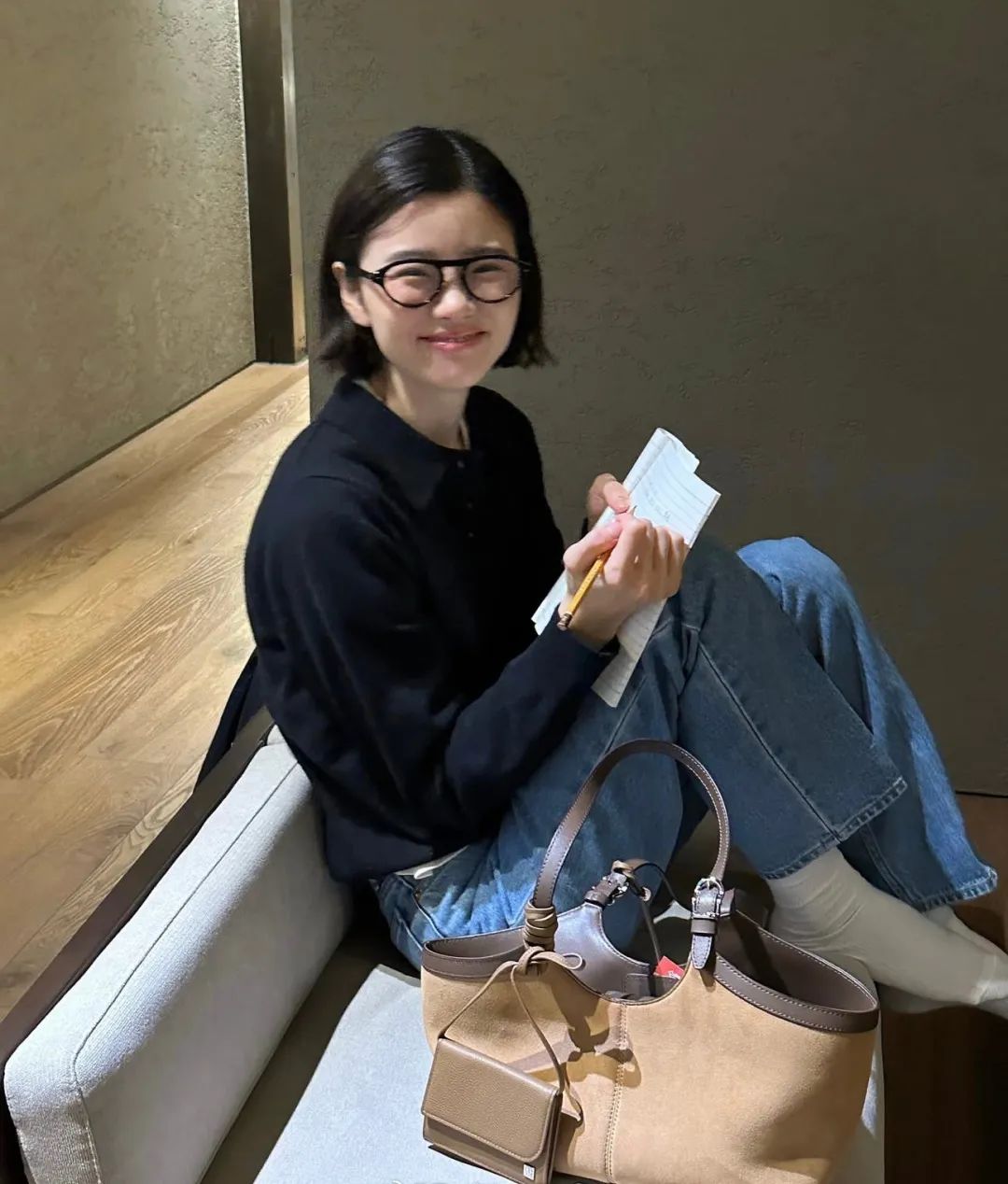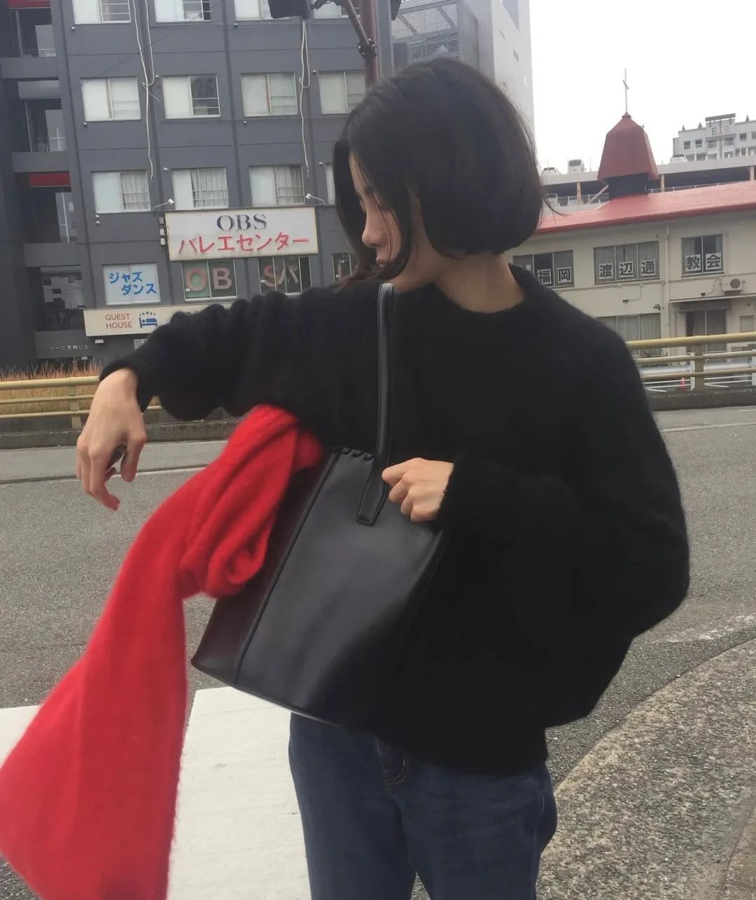 在黑白当道的高级感穿搭中,想穿出彩,颜色在精不在多。围巾的一抹红色既让整体颜色有呼应,又不会显得太过。搭配最基础的黑色针织衫、牛仔裤和大托特包,很潇洒。