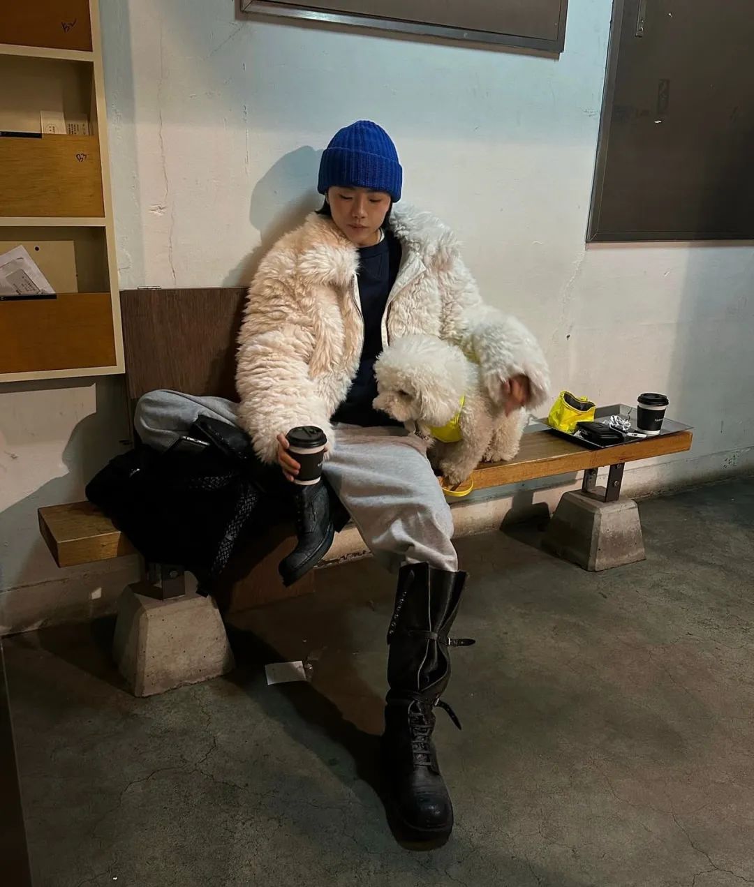 这种饱和度不算太高的宝蓝色很适合作为整体造型的颜色中心。搭配冬季常见的黑白灰,既不乍眼又很有氛围感。想要维持少年感,穿着的宽松度就不能忽略。运动裤配长靴的组合既帅又修饰比例。
