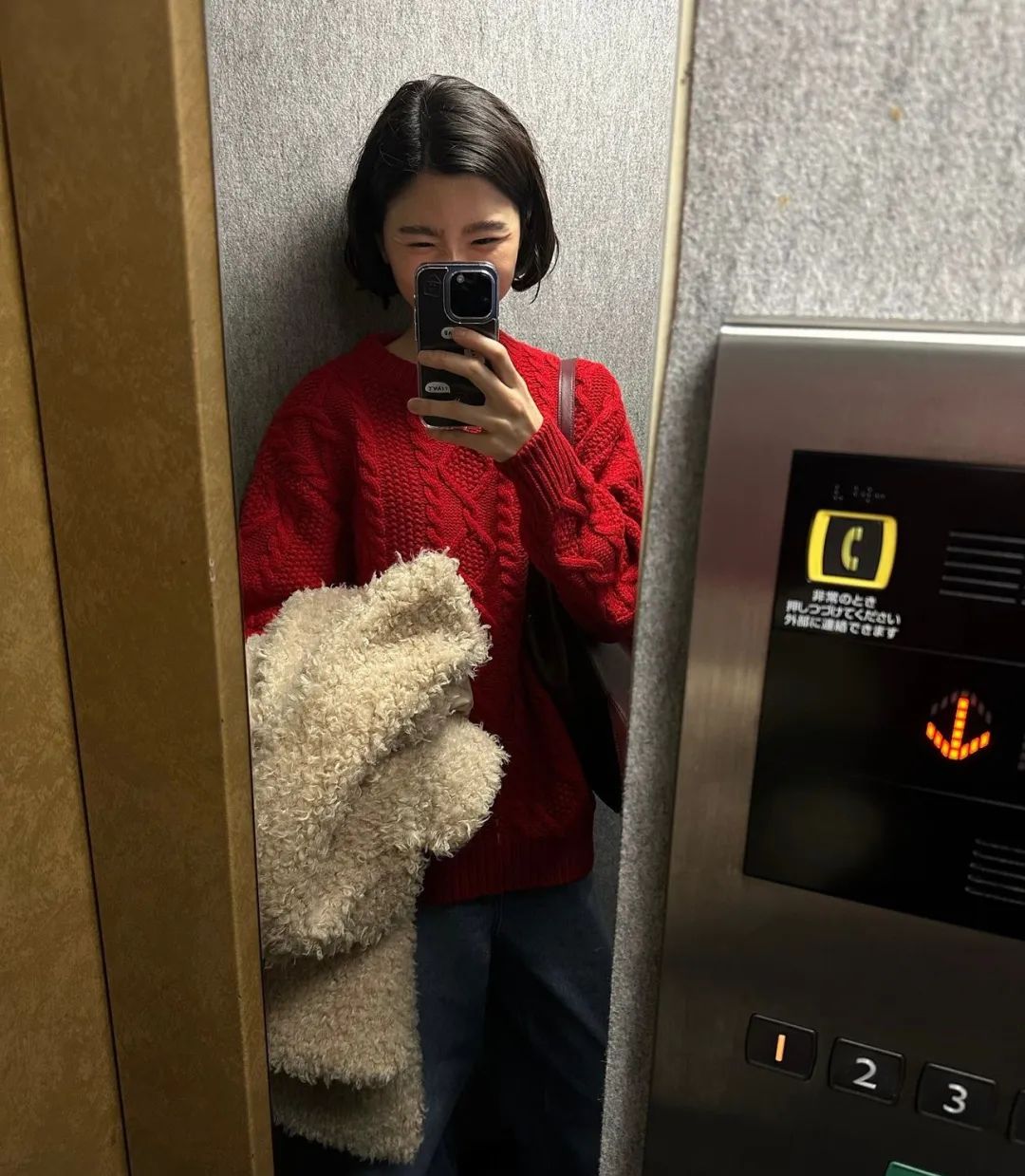 如果减弱其他单品的存在感,红色也可以扩大面积上身。比如这件深红色针织衫,搭配经典蓝牛仔裤就很有复古味道。