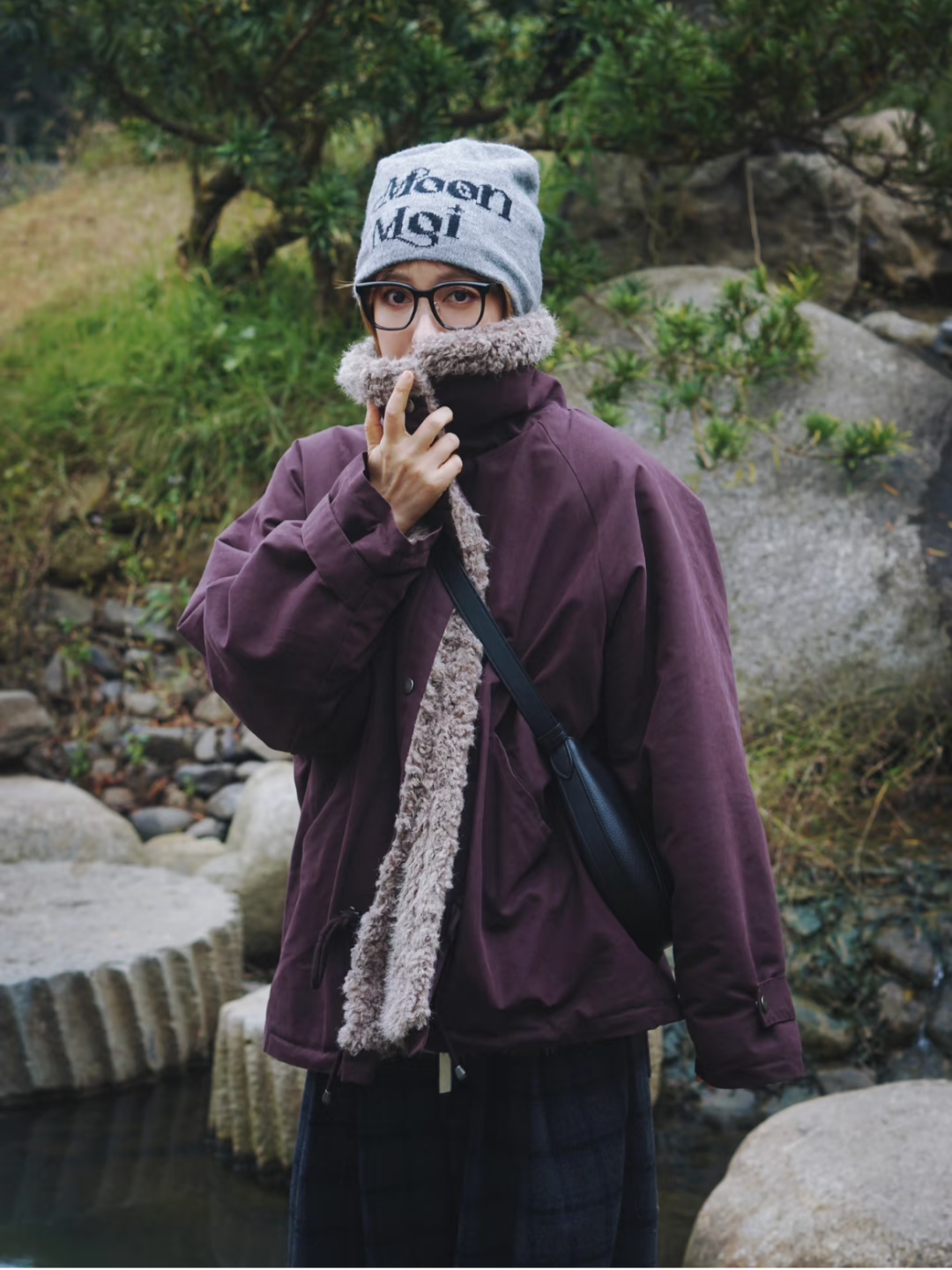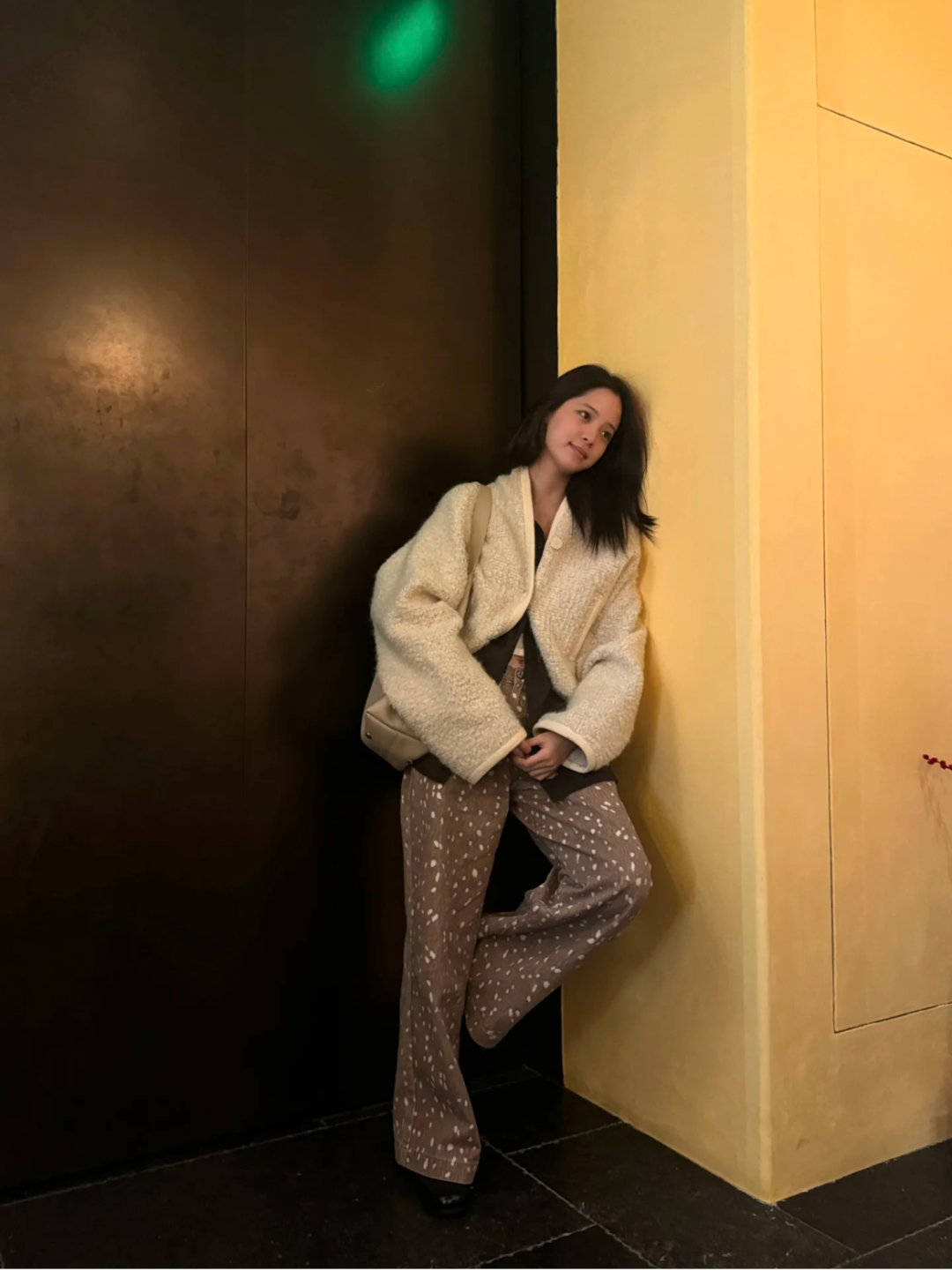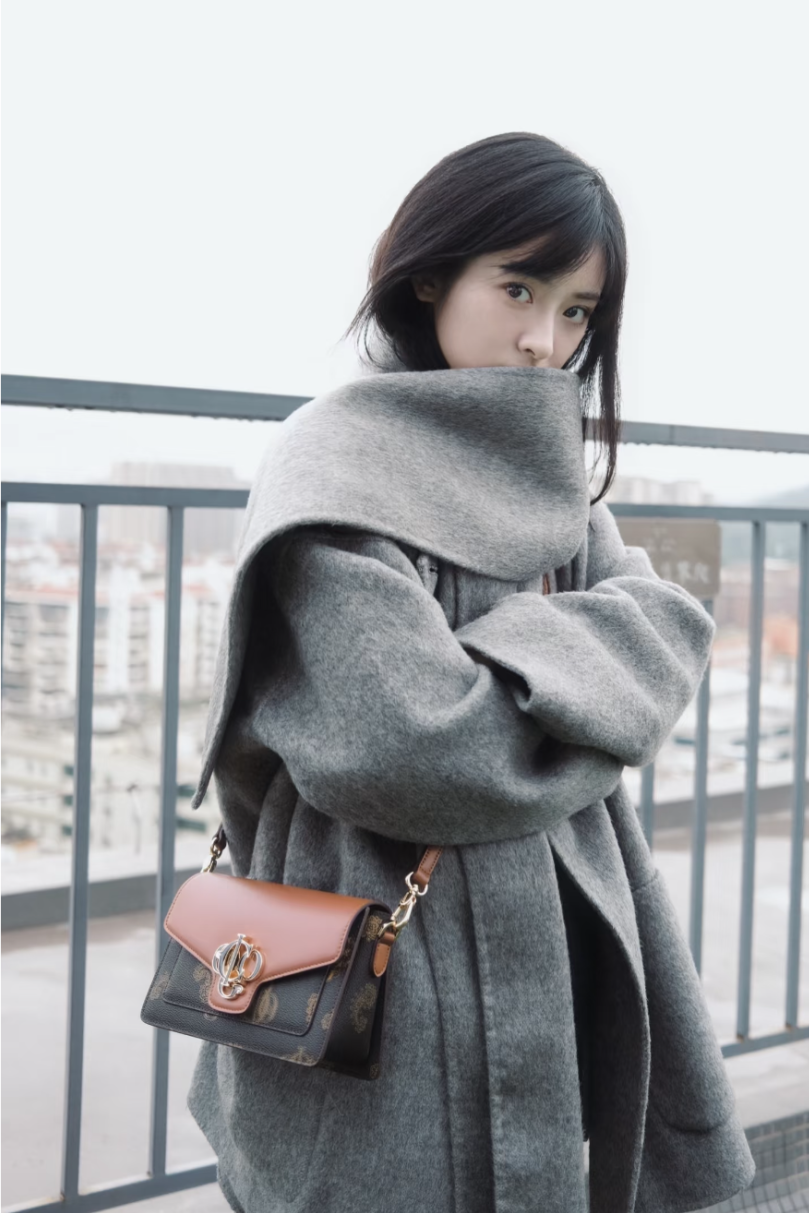 抓绒的羊羔毛在比皮草看起来更日常,吴千语用一只同样毛毛绒的手袋点缀,温暖氛围更加浓郁。