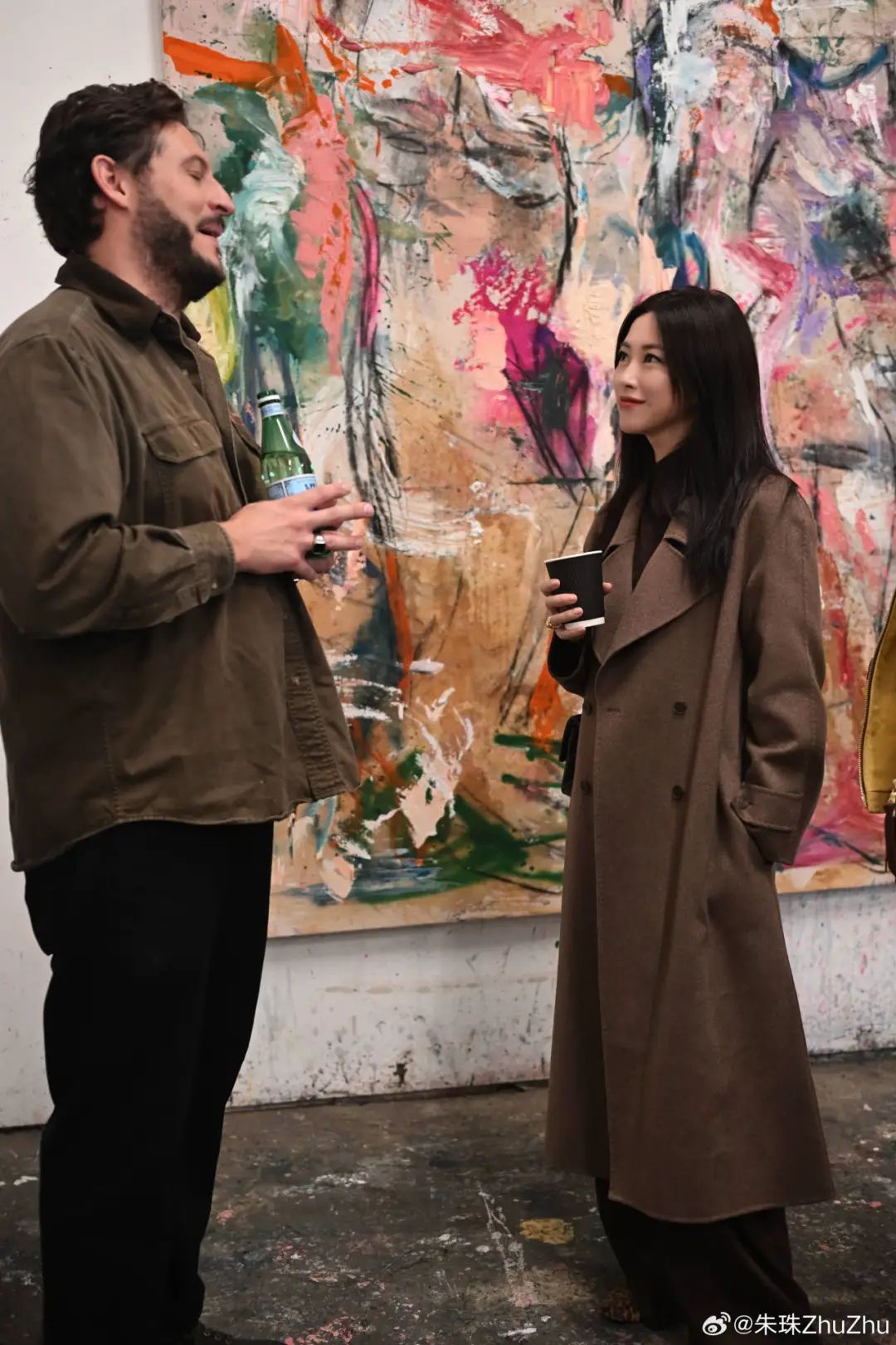 朱珠看展ootd搭配了深棕色大衣,相较于黑色,深棕色增添一份优雅与柔和,和高领内搭组合,自带文艺书生气~