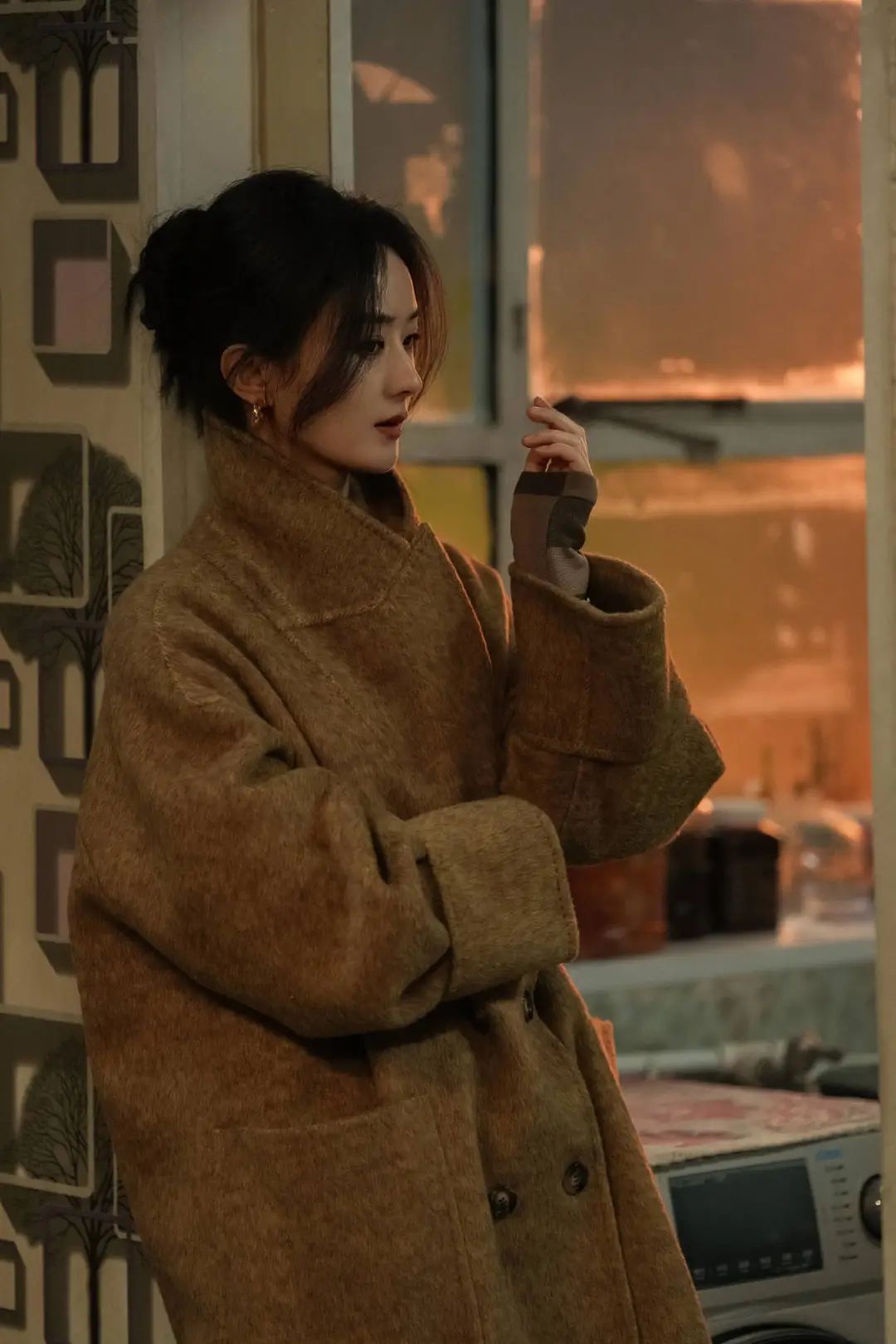 赵丽颖这件茧型建材的棕色大衣更偏复古,半立领的穿搭妥妥的不输气势。