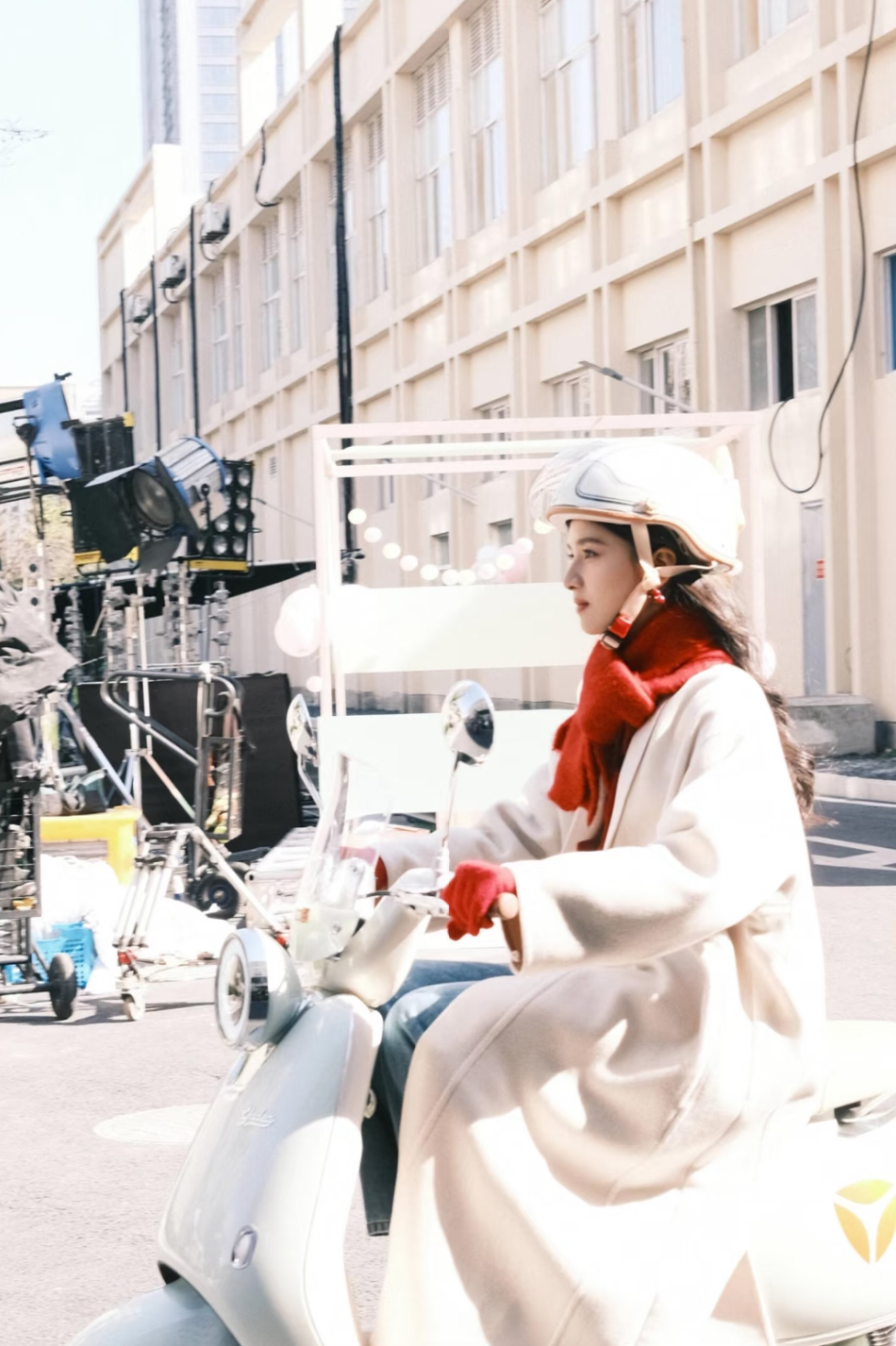 张婧仪这件白色羊绒大衣则将清纯学生气拉满,红围巾和手套点缀,亮眼且有活力,尤其是骑上小摩托一整个“女大”既视感。