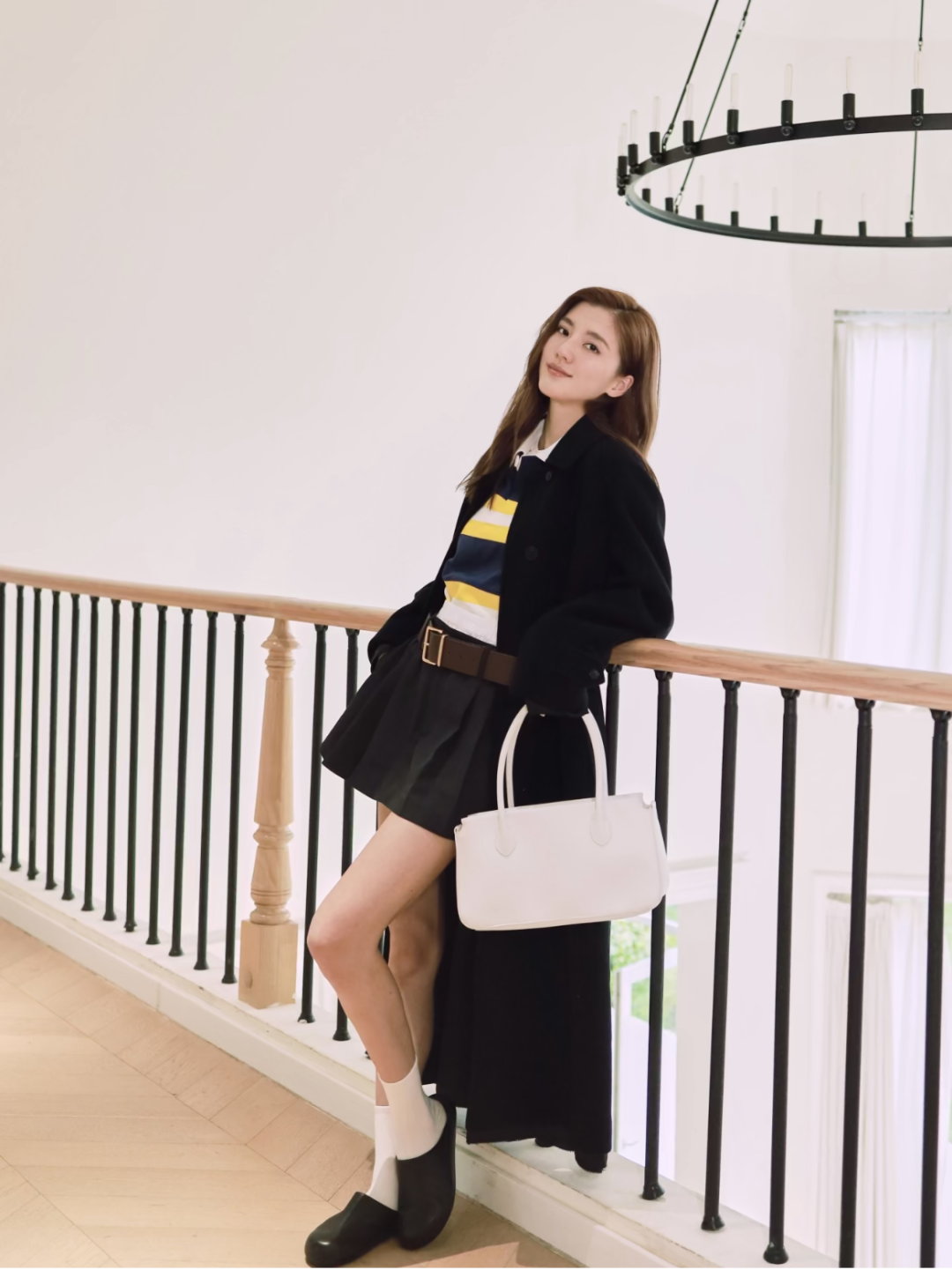卢昱晓一身全白色造型,很容易穿出了淡系文艺感,白色羊羔毛夹克嵌入皮革的线条,细节中透着时髦心思。