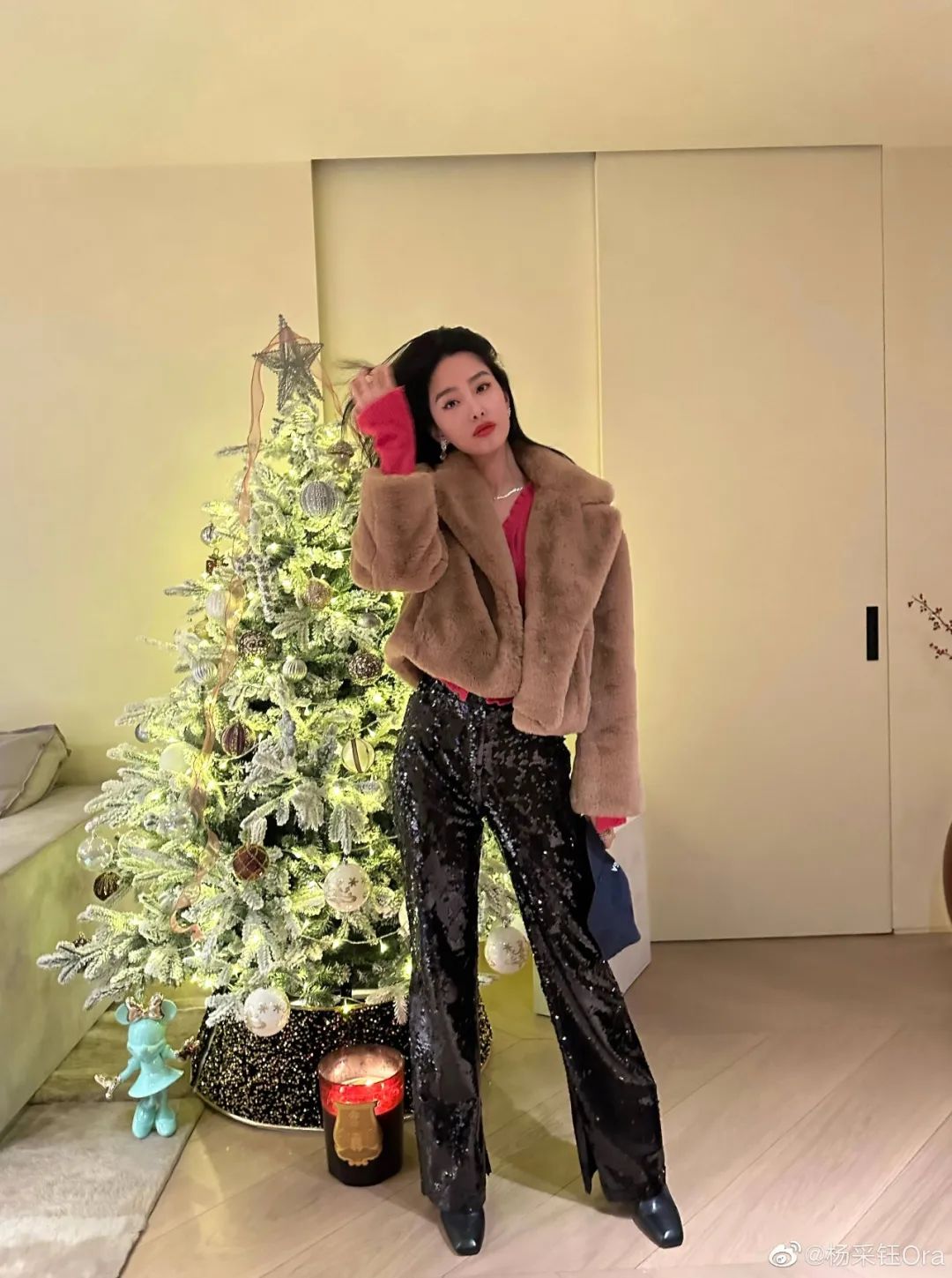 杨采钰这件皮草短外套搭配黑色亮片长裤,节日氛围呼之欲出。