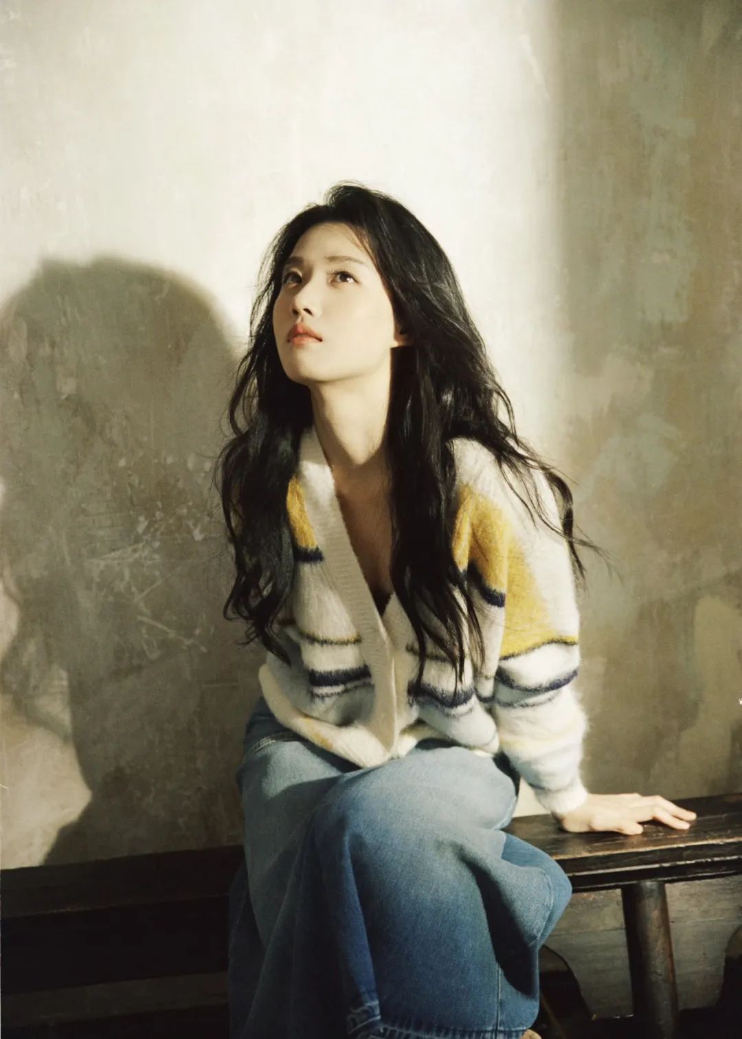 比如衣服的黄白和背景的淡黄色就有联动,再叠加一个胶片滤镜,更让整个镜头充满了故事感。不强调单独五官,而是更重着笔于整体氛围的方法很适合淡颜。