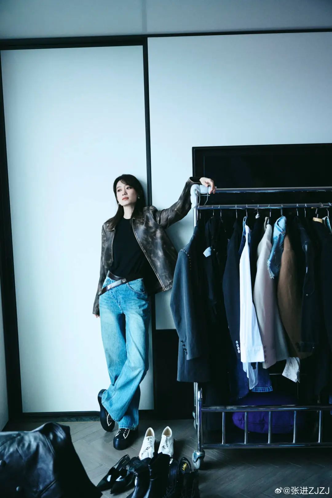 牛仔裤减弱了西装、衬衫这类的单品刻板印象,整体的浅色调更添轻松休闲。