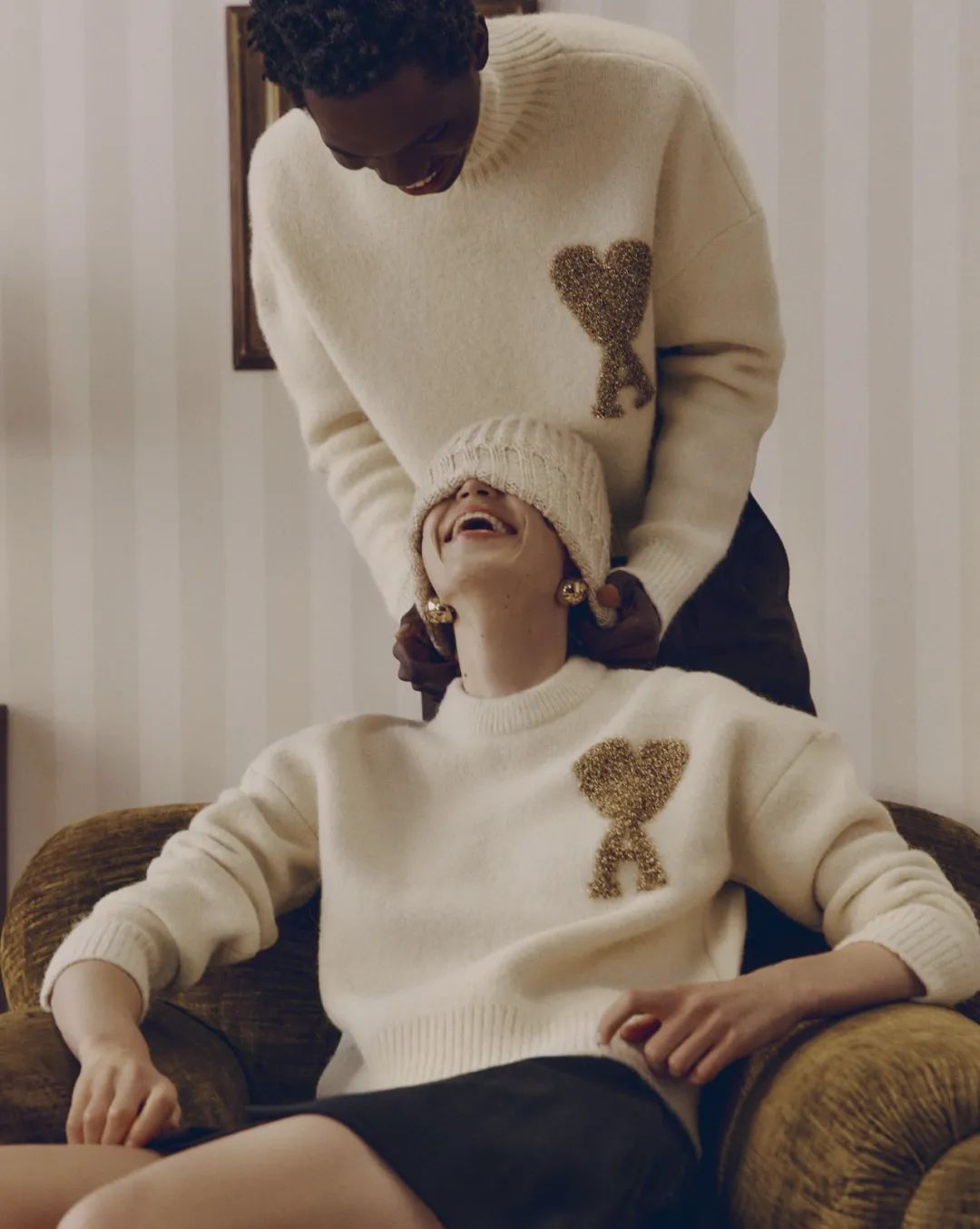 AMI采用米色、棕色、金色和米白色等品牌标志性配色,演绎暖意融融的节日氛围。面料以棉质华达呢和羊驼毛为主,柔软舒适。