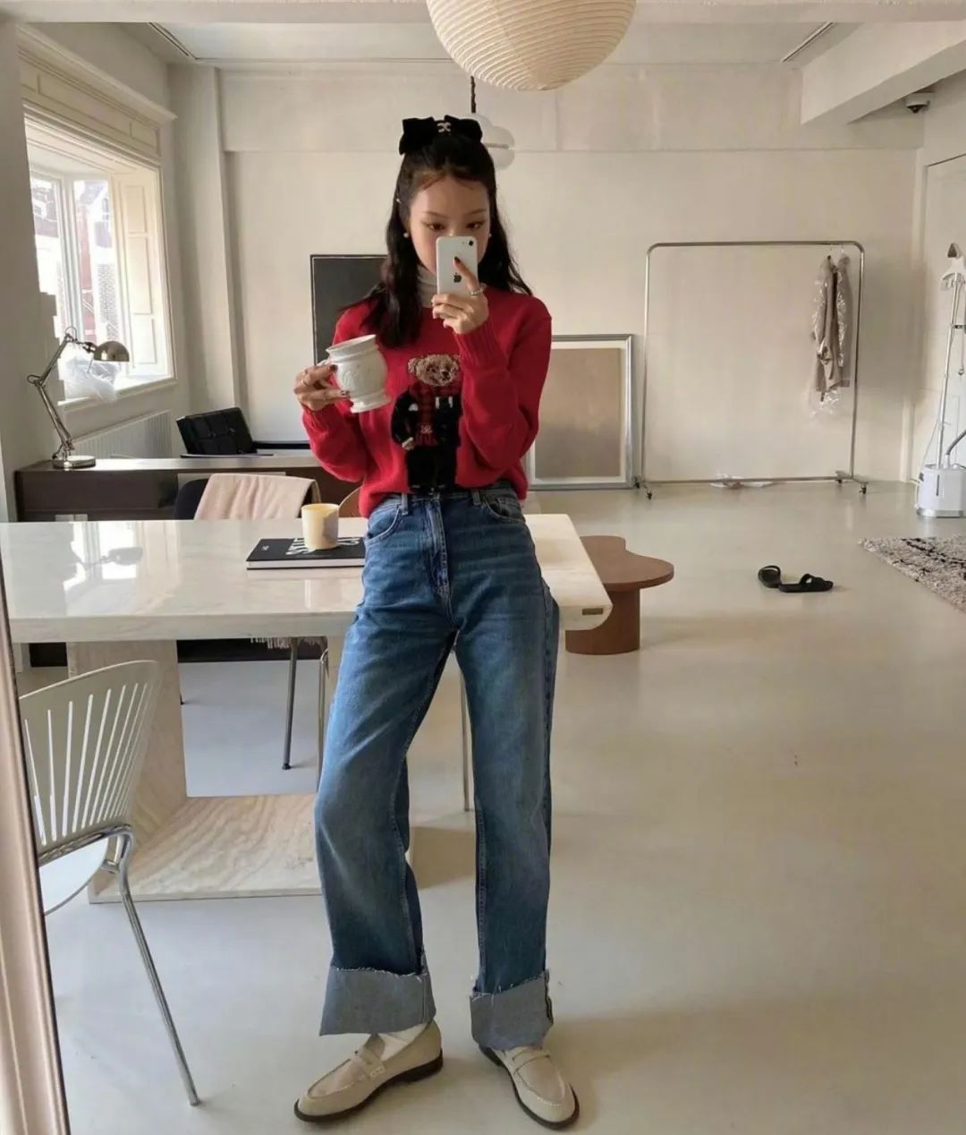 不少美女的节日选择偏爱红色作为主色调,相对来说不难驾驭,喜庆的颜色不管是圣诞元旦或者过年都很适合。简单的费尔岛毛衣配复古丹宁牛仔裤,松弛感拉满。看似和整体休闲风格相悖的珍珠饰品和蝴蝶发饰又恰到好处地给整身look增添了优雅女人味。