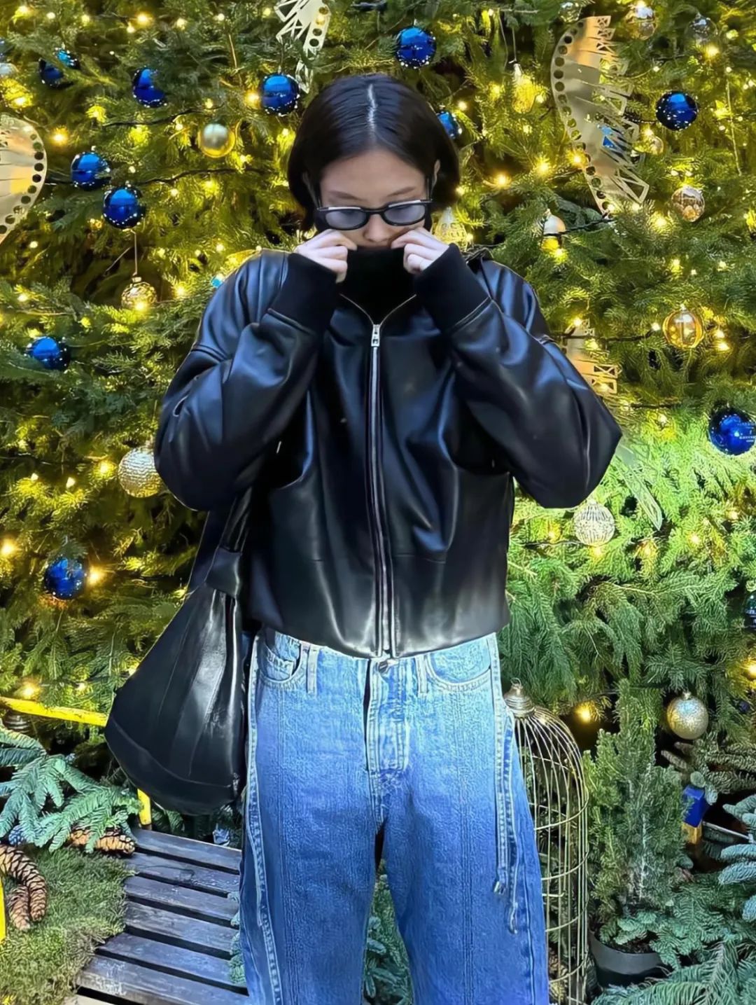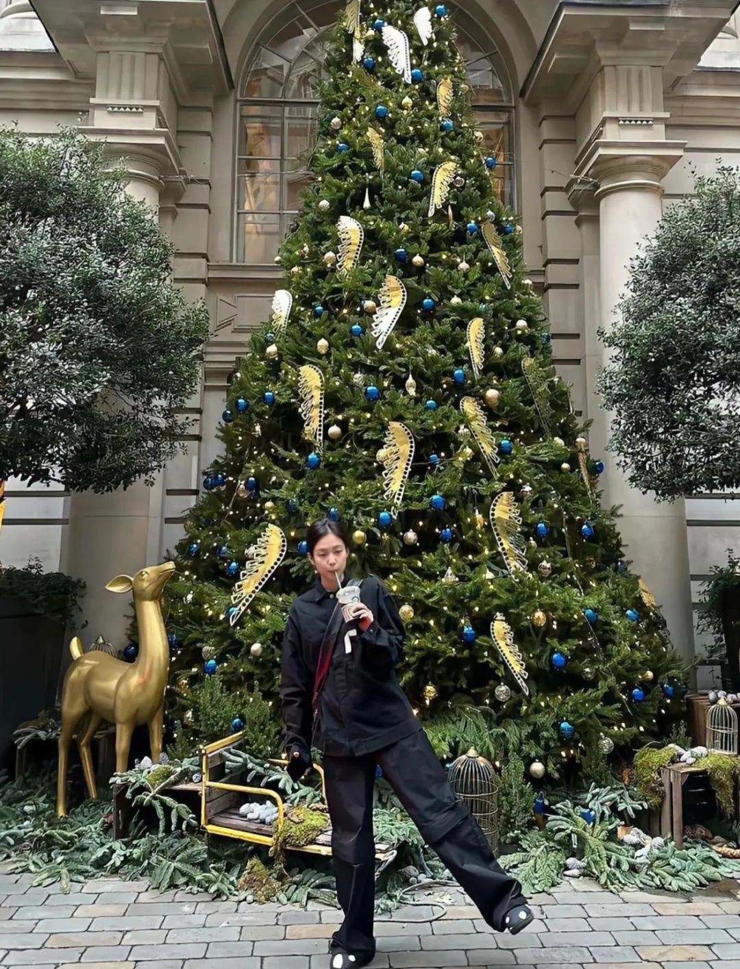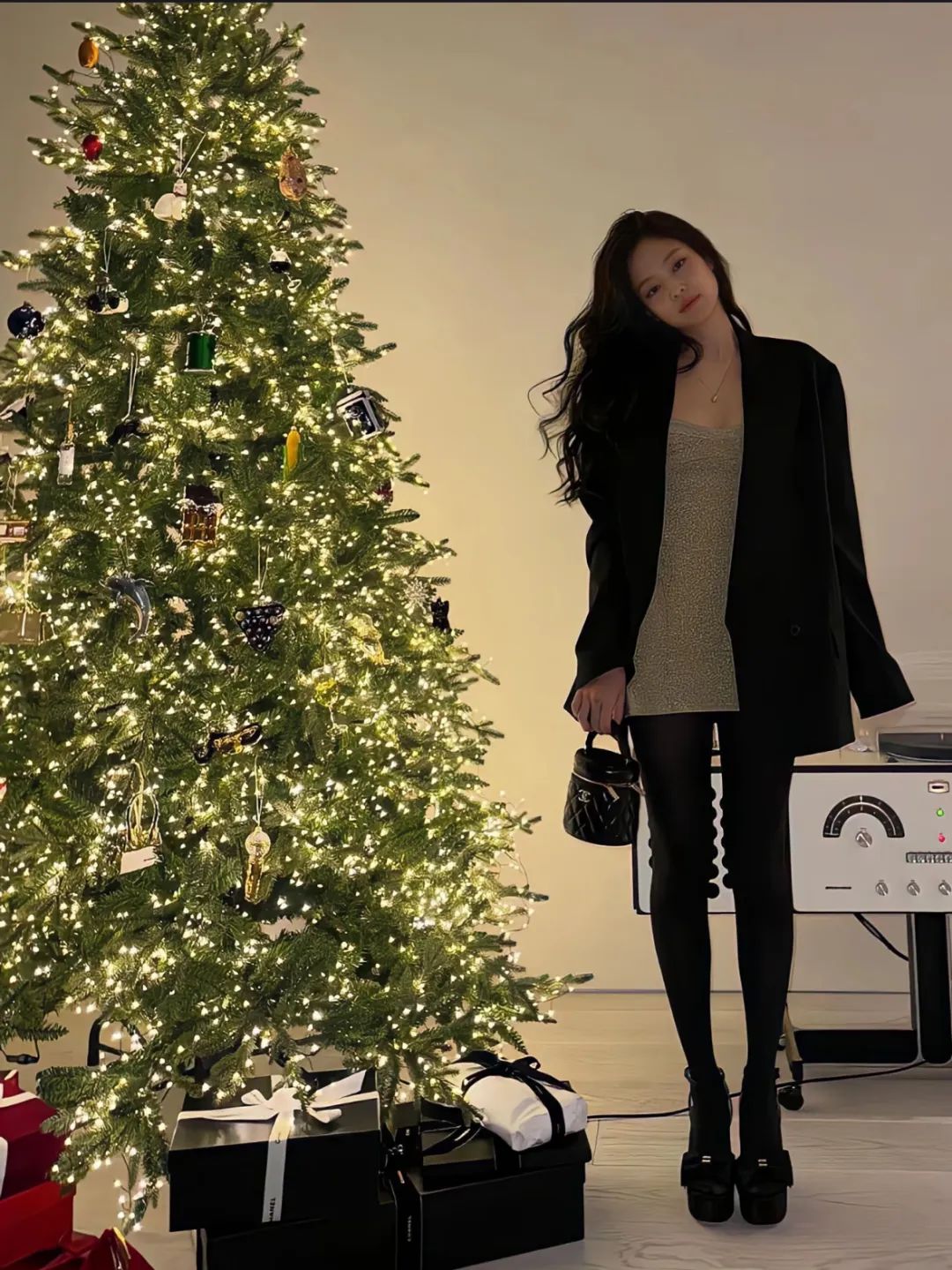 同样是出片模范生的Jennie相对来说更随性,也更注重和背景的互动。比如金色灯光的圣诞树已经足够亮眼和吸睛,Jennie就放弃了彩色路线,而是选择了带金线的针织裙来呼应,这种呼应比起简单的叠加彩色,会让穿搭更格外有质感。