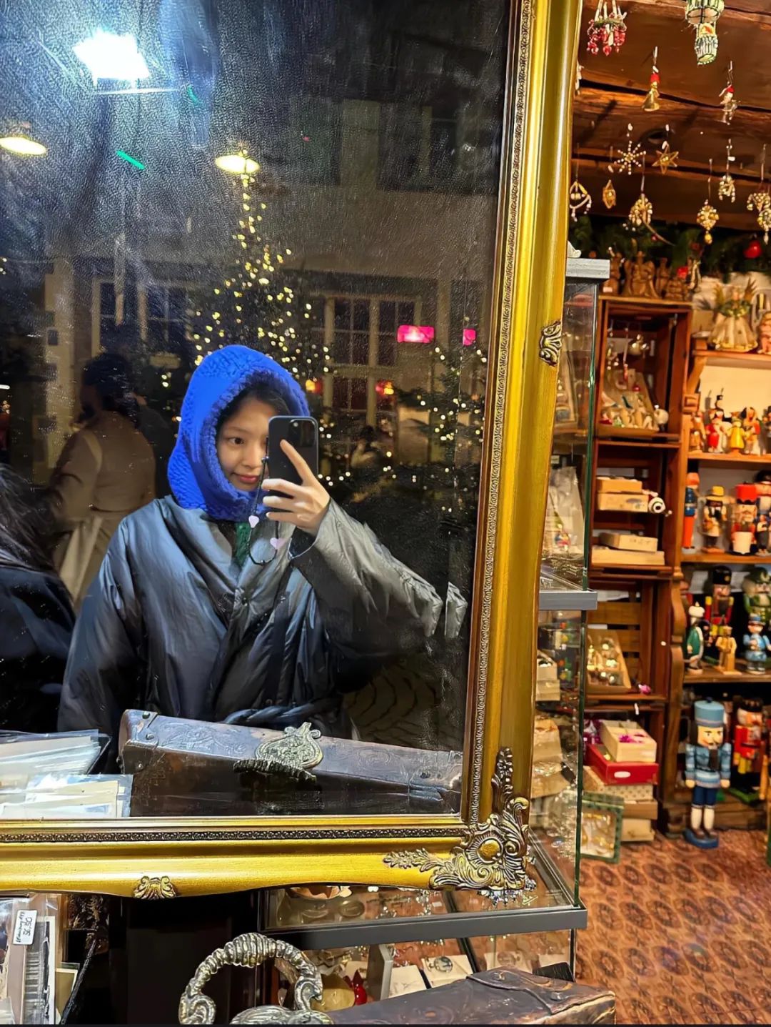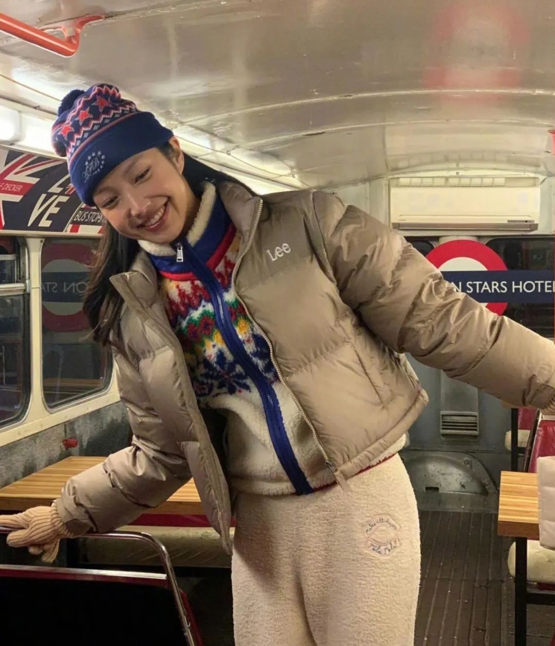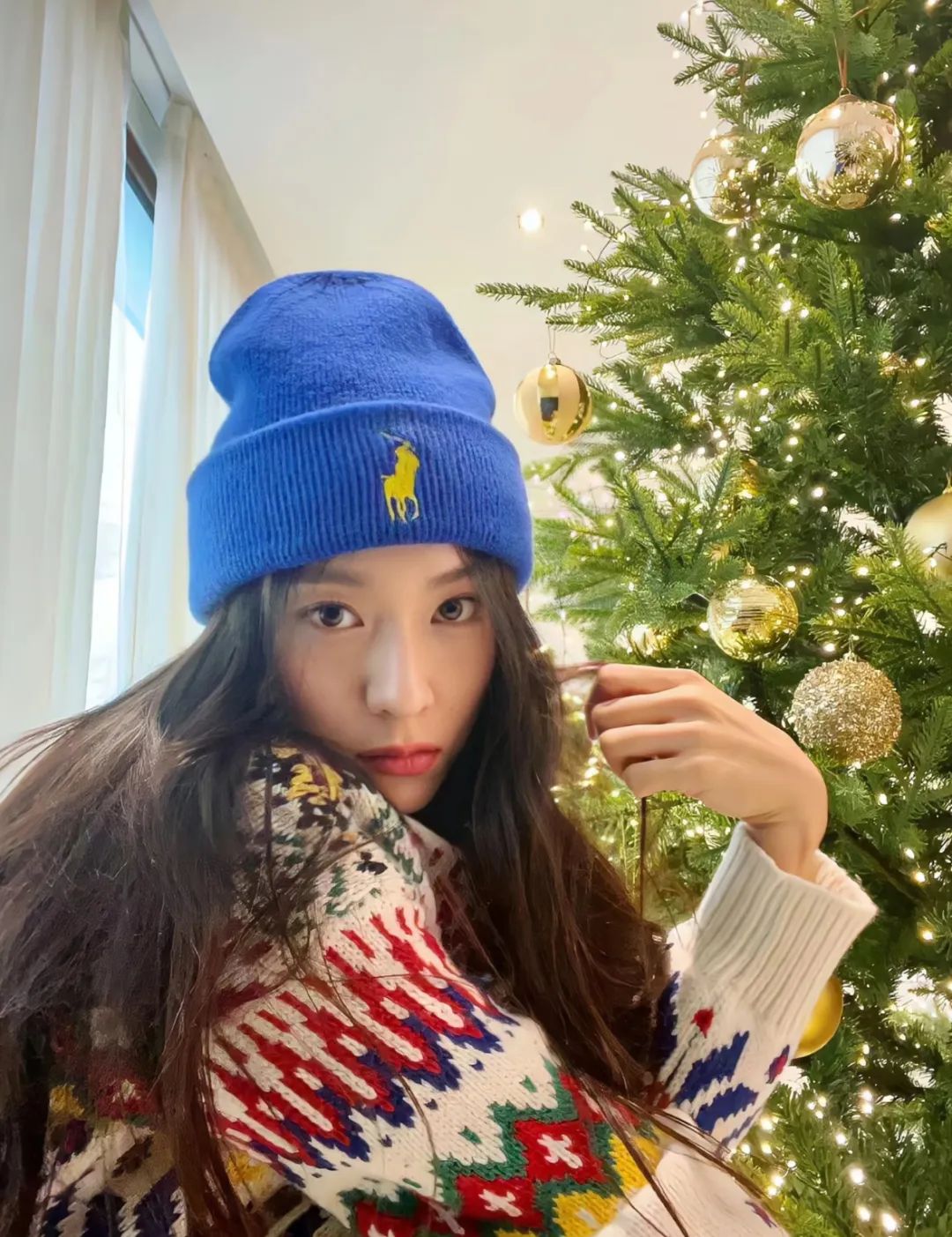 同样是出片模范生的Jennie相对来说更随性,也更注重和背景的互动。比如金色灯光的圣诞树已经足够亮眼和吸睛,Jennie就放弃了彩色路线,而是选择了带金线的针织裙来呼应,这种呼应比起简单的叠加彩色,会让穿搭更格外有质感。