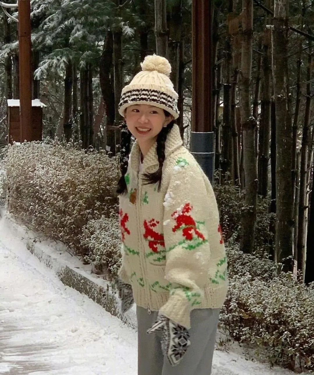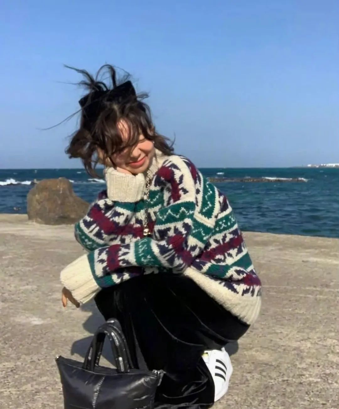 一贯被奉为穿搭模板的郑秀晶给出的答案很标准。彩色系费尔岛毛衣相当有节庆氛围,浅棕色的基础色调很适合黄皮姐妹,搭配白色裤子温柔又俏皮。谁说保暖和时髦不能同时拥有?