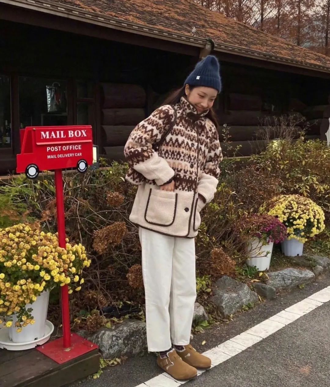 毛茸茸单品和费尔岛风也很匹配,摇粒绒的温暖质地和费尔岛花纹的温暖属性不谋而合。不会搭配的姐妹直接无脑选择同色系,相近花纹,整个人的气场一下就会明朗起来。