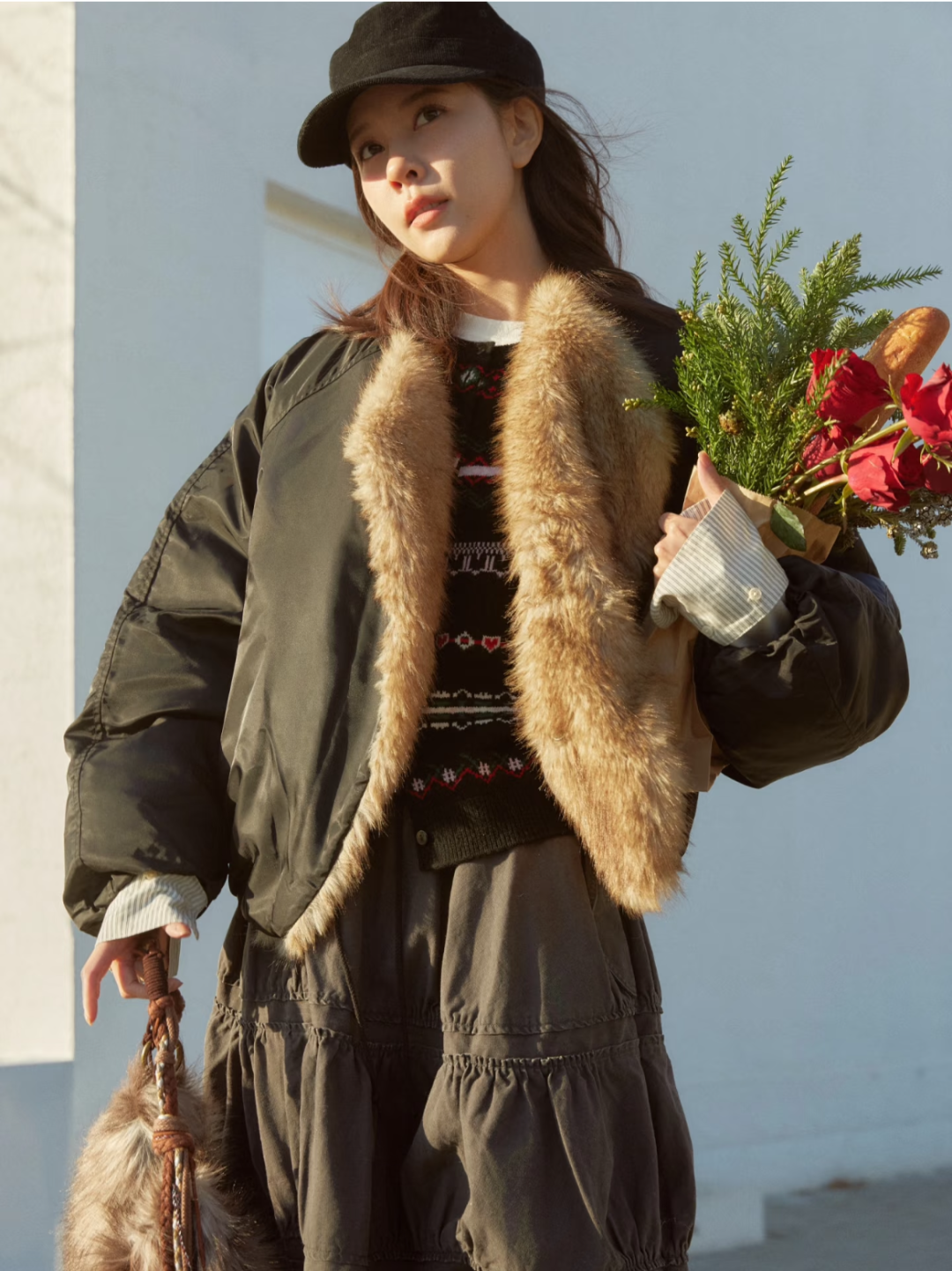 红白杂色就有过年那味儿了,比大红色更好驾驭,缆绳编制或平纹针织都很有复古味道,杨采钰和赵今麦用丝巾或巴拉法拉克帽的点缀,可优雅可少女,各具风格。