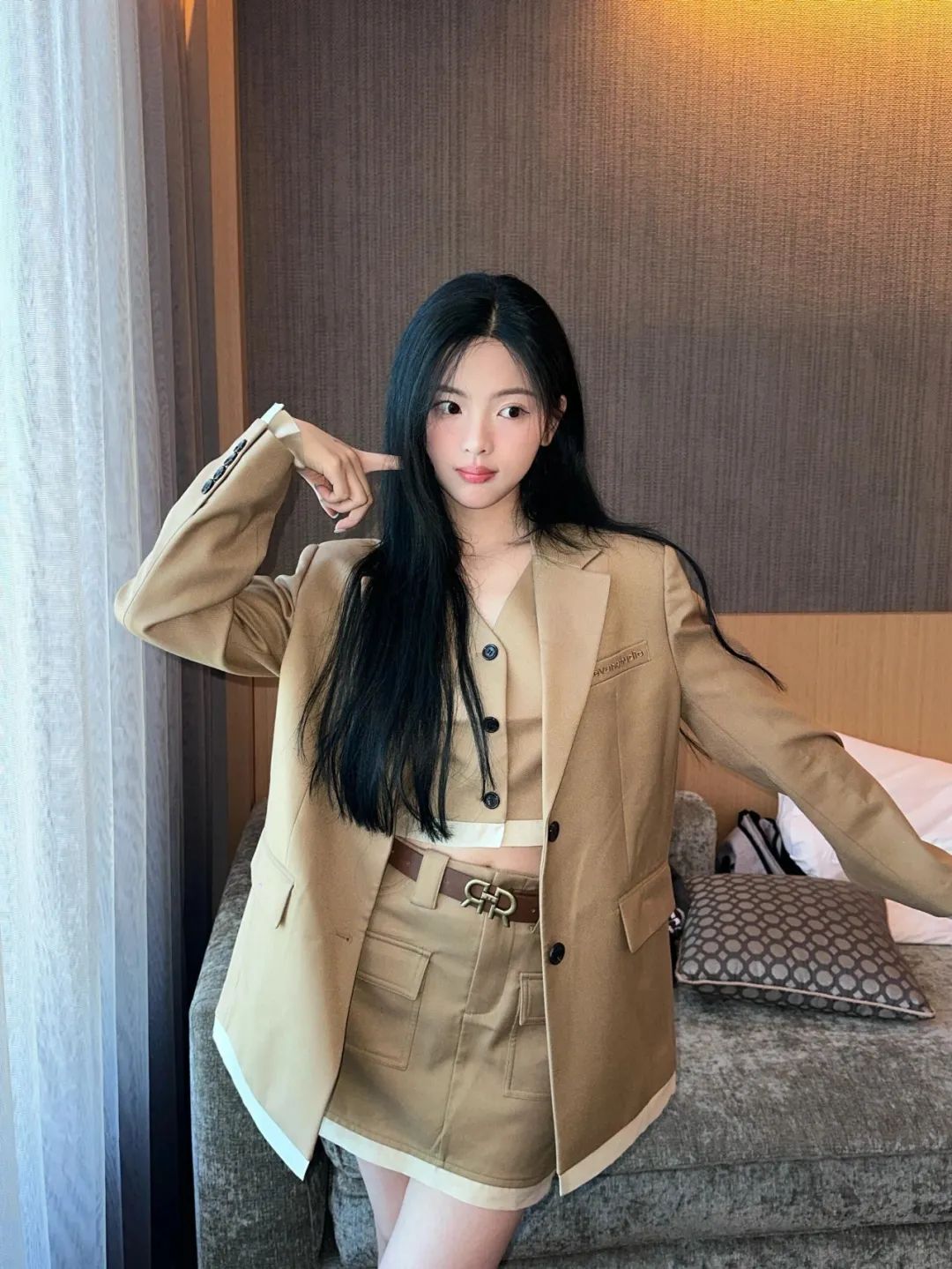 各种套装对她来说,真的是手拿把掐。棕色西服与包臀裙的套装像是为她量身定做的造型,稍稍露腰的设计平衡了成熟感与学院风,丰富女性的多面。