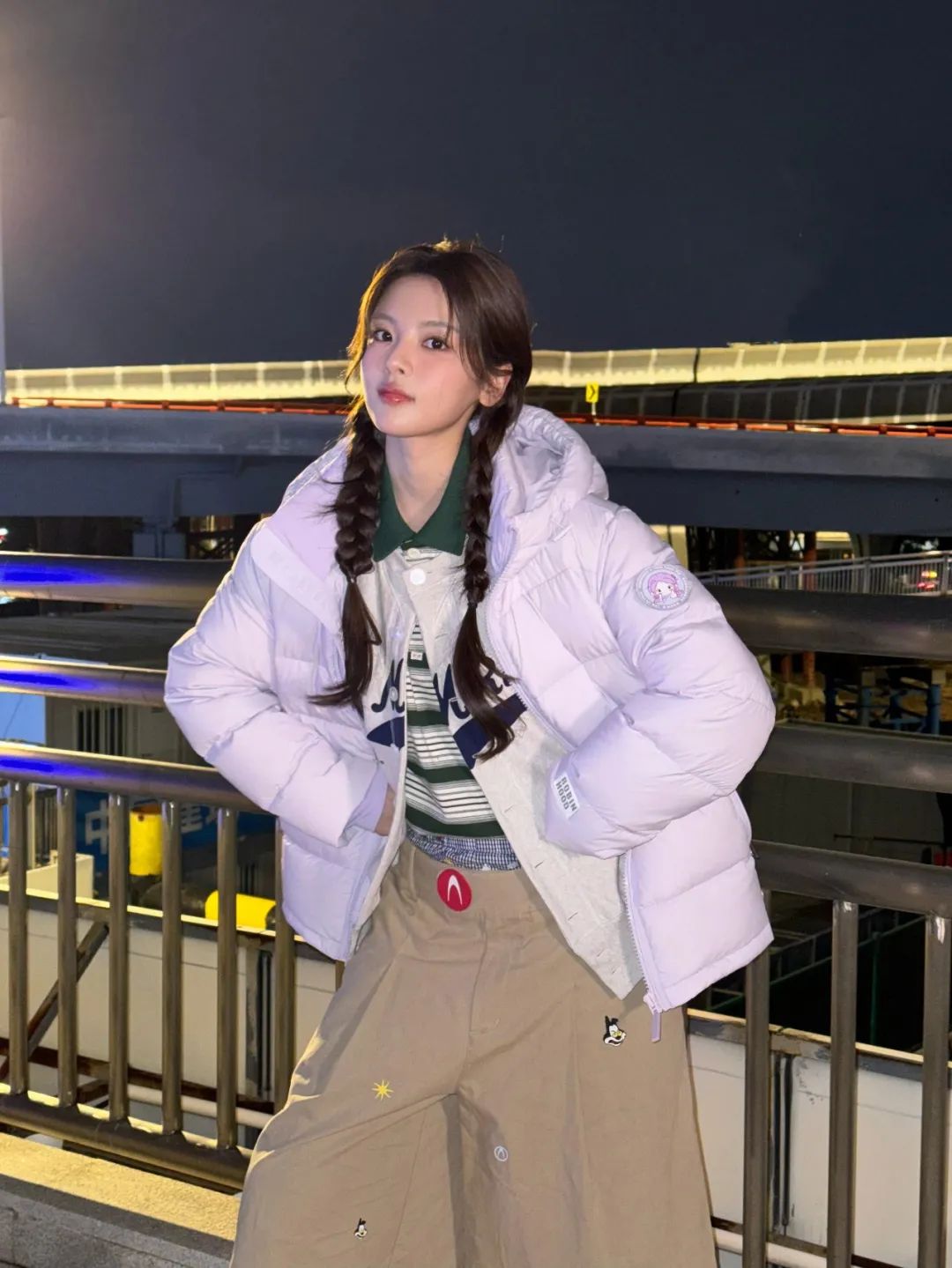 条纹衫这一身,青春气息扑面而来。白绿色的条纹展现出活泼与生机,多层次的下装和长袜的点缀填补了造型的细节,还增添了几分潇洒的气息。整体造型完成度很高,再外加一件羽绒服也十分和谐。