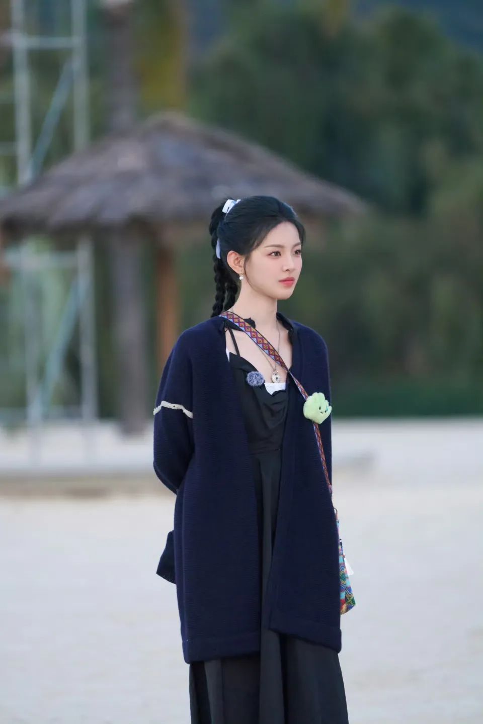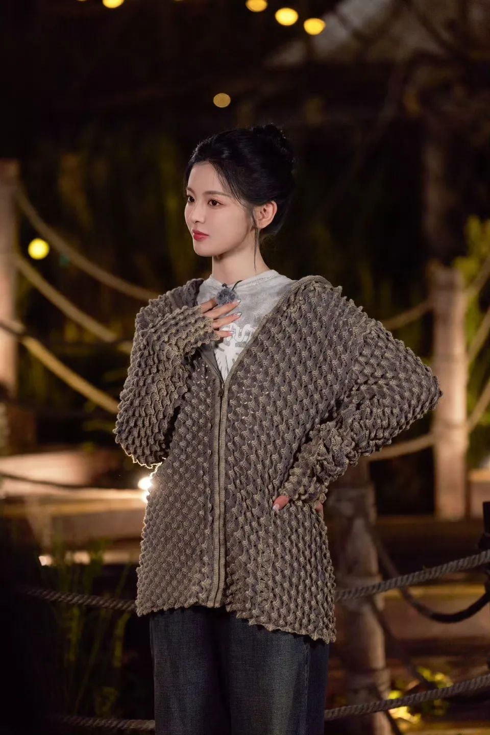 波点很容易打造出俏皮感,杨超越用波点开衫搭配半裙,浪漫氛围十足,耳边的小巧耳饰和蕾丝围巾围整体look增添一份精致。