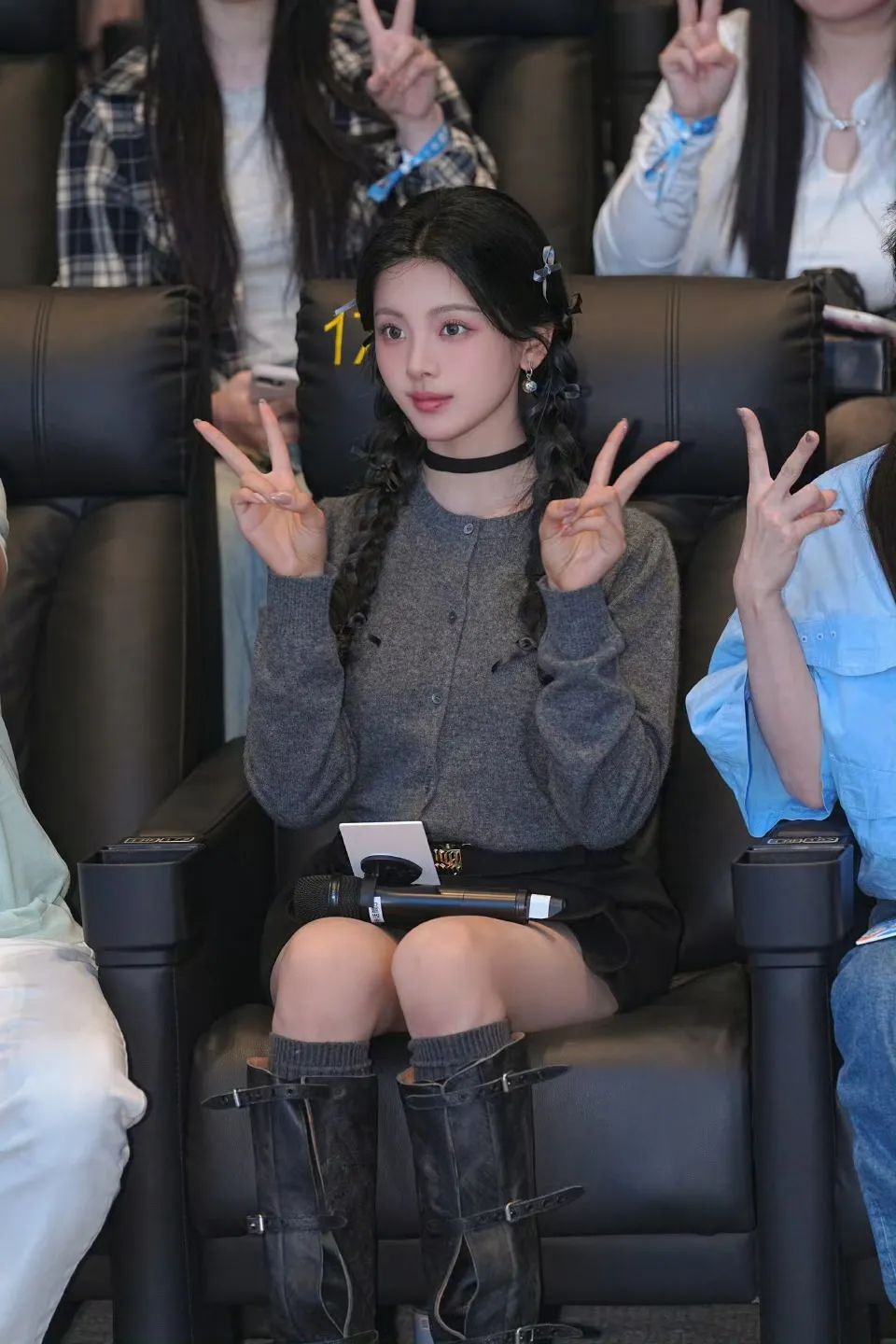 而换上没有波点的简单灰色开衫,杨超越选择搭配一双机车长靴来增加造型的份量感,另外choker的加入让这一身不会陷入单调,呈现出丰富的层次感带来别样乐趣。