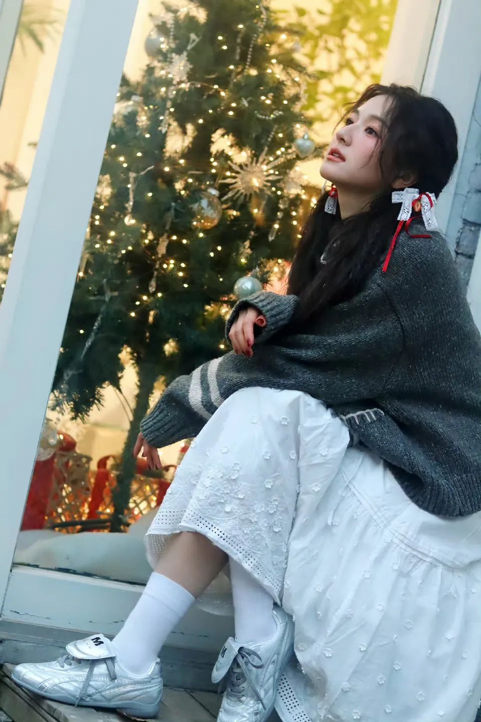 搞氛围,还得看这届年轻人的!毛衣搭配白色半裙,头发上的装饰加入了圣诞新年的色彩,为一身look锦上添花。
