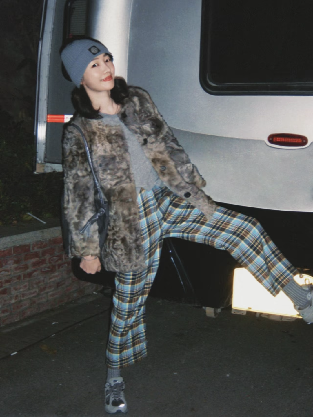 彩色格纹也加持了一份“复古”气质,比如亮蓝色格纹裤搭配动物纹毛绒外套,一扫深色皮毛外套的老气!