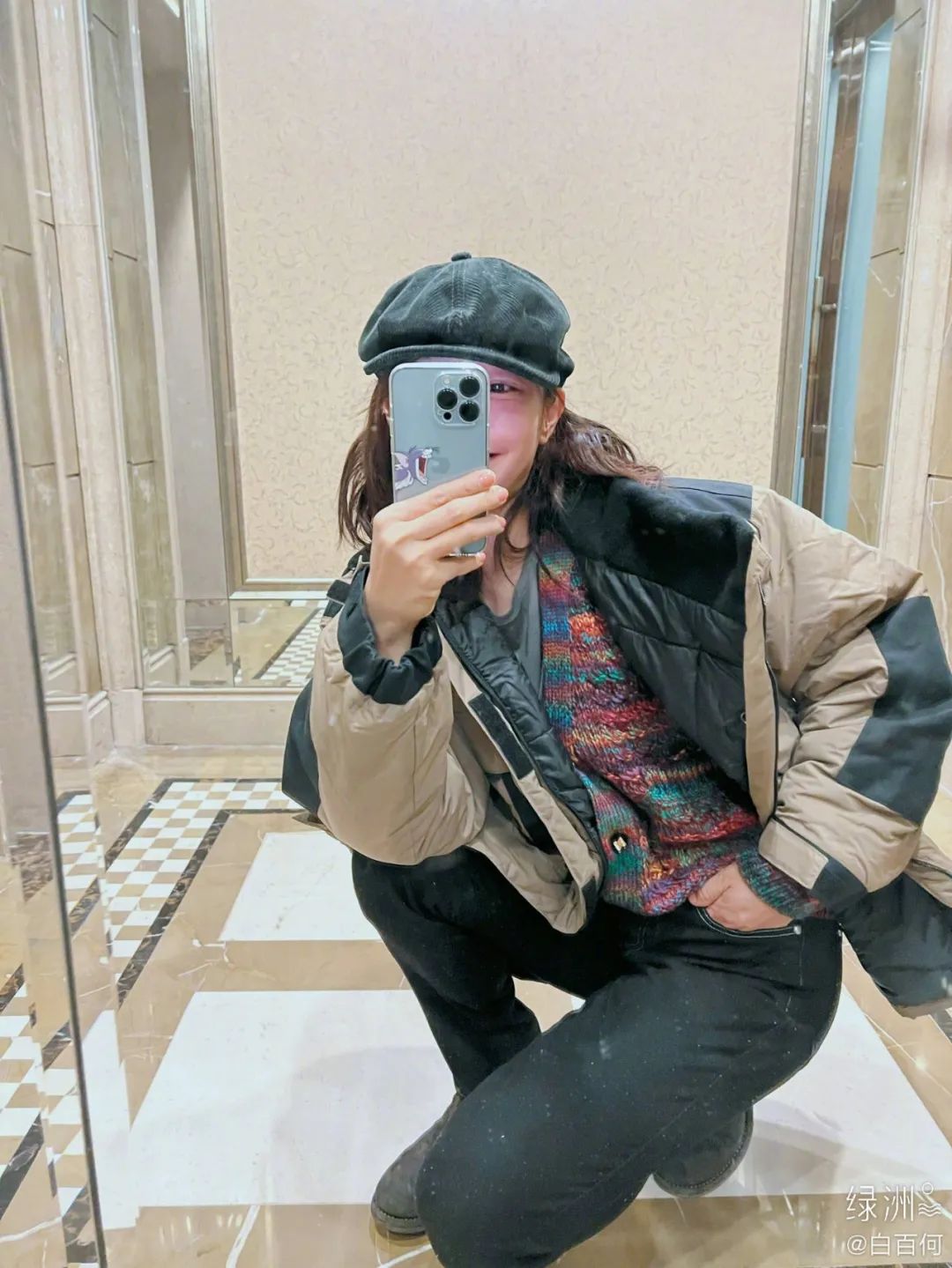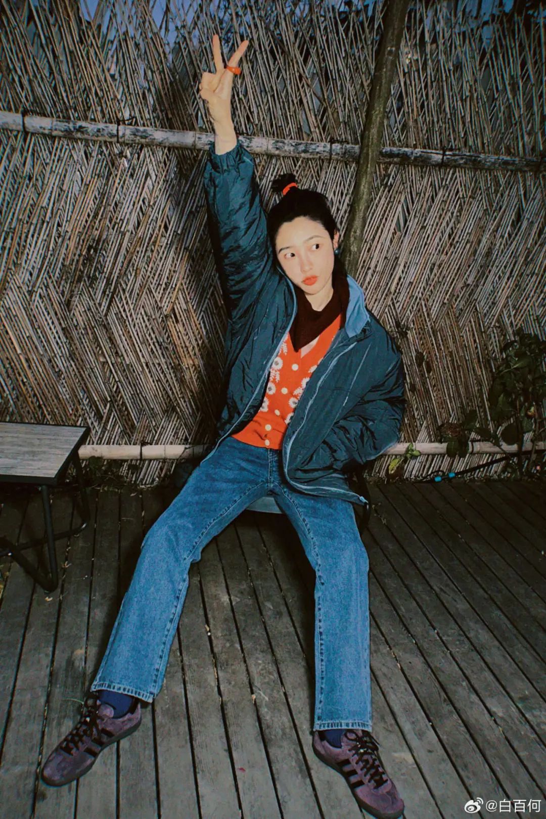 “女大感”的平光镜、针织帽、叠戴的配饰让细节更为丰富,很随意但又很舒适,搭配白姐招牌性笑容,也让整个人充满了旺盛的活力。