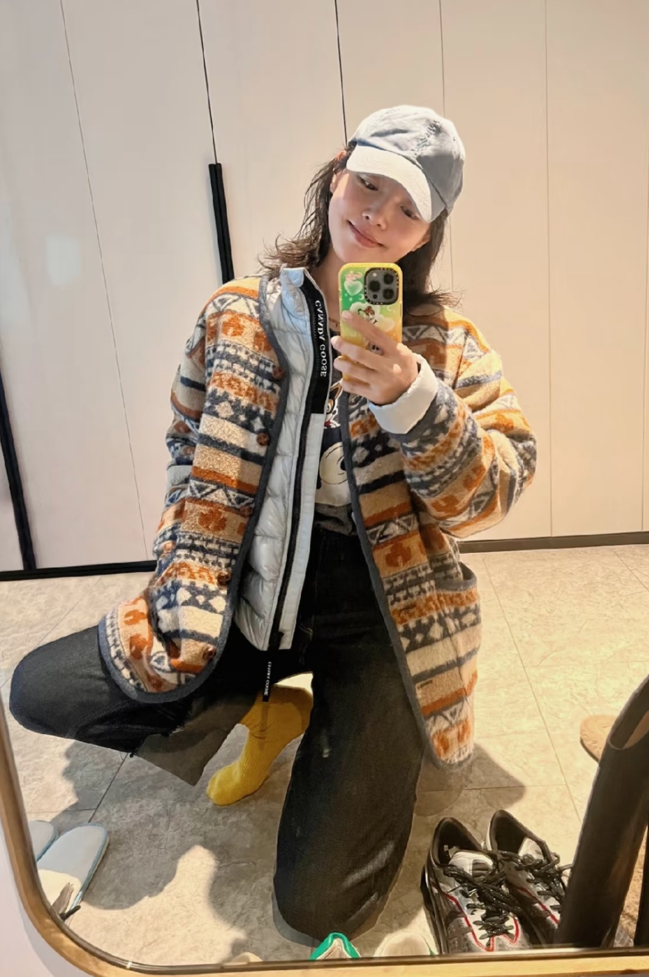 白姐也有属于自己的“巴恩风”,军绿色谷仓夹克利用棕色的棒球帽与灯芯绒领边呼应,浓郁的复古味道!此外,她还用黄色条纹针织碰撞藏蓝色巴恩夹克,整体更加活泼~