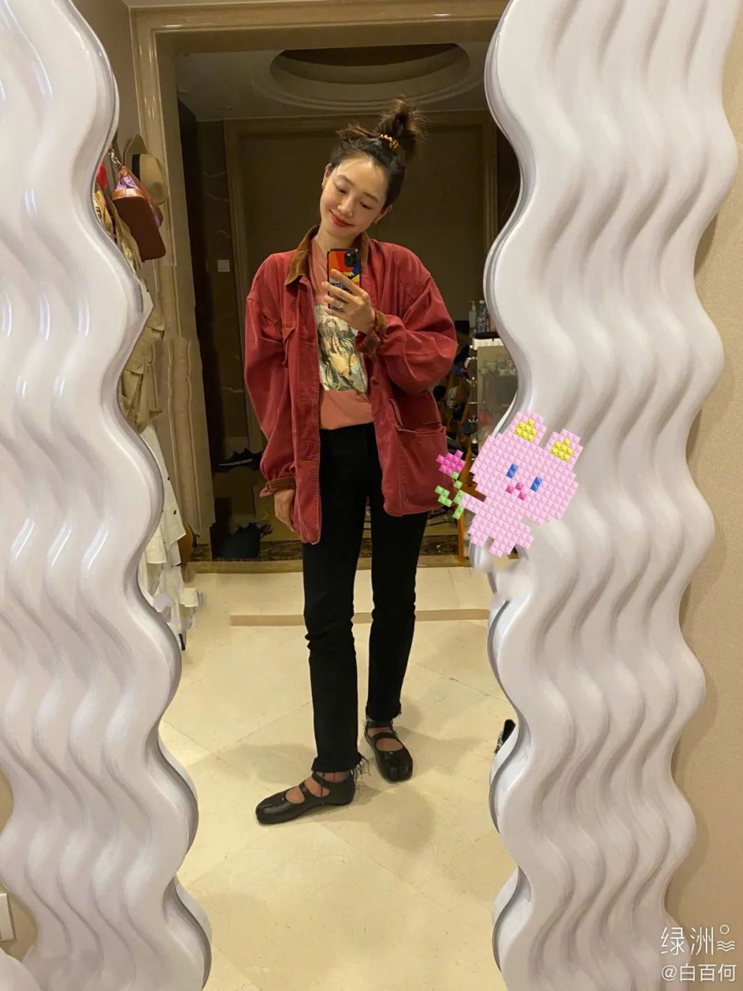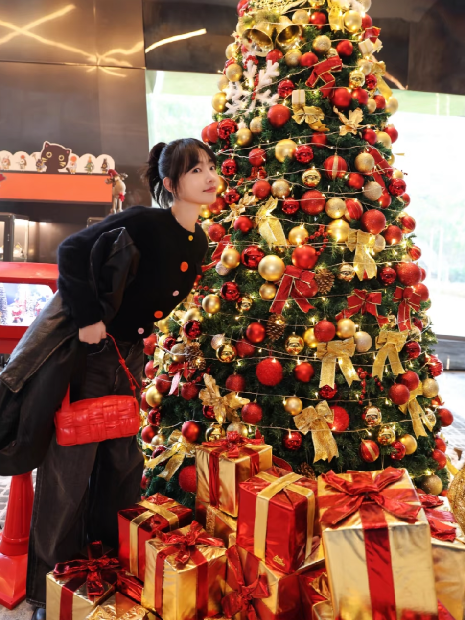 也可以直接用手袋、鞋履这些配饰,或是带有红色元素的单品增添节日感。当然如果款式上在讲究一点,也会让风格进阶。比如,白姐选择了用红色芭蕾舞鞋搭配裤装,时髦点睛。