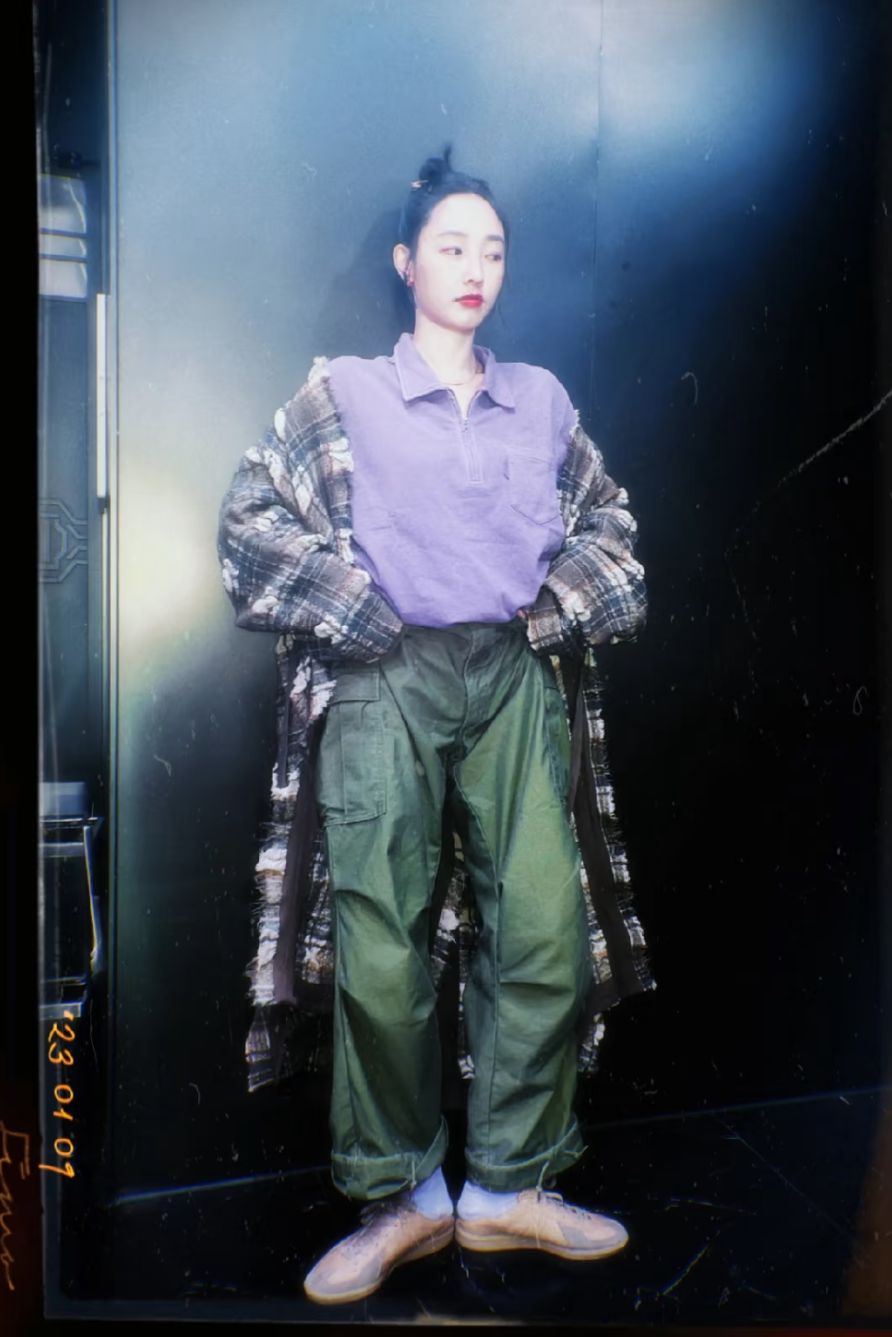 紫色polo衫+绿色工装裤+深色格纹,看似毫不相关的元素被它稳稳消化,搭配一双复古德训鞋,古着感满满。