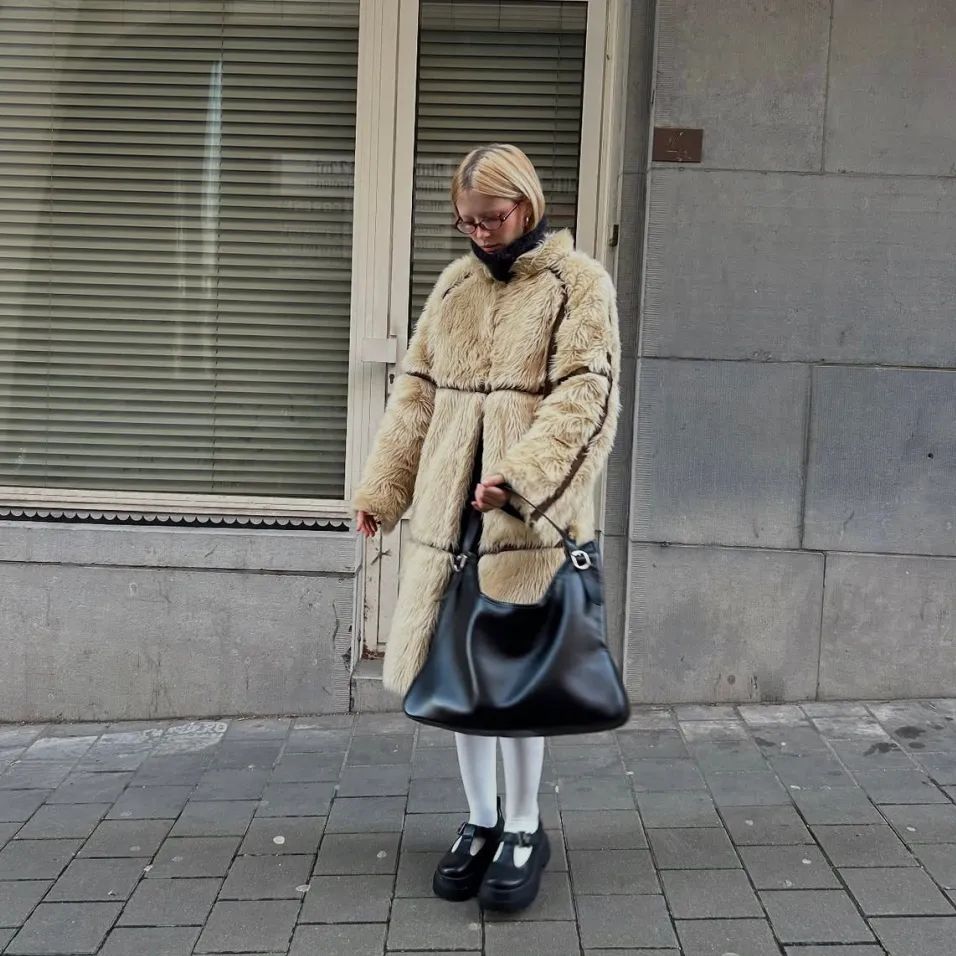 这种大翻领的皮草稍有不慎就容易显得特别正式,如果不想太过板正或者担心显年龄,可以用一些减龄单品来调和整体气质,比如加一个同色系的连帽卫衣,和大翻领搭配起来就不容易显得突兀。