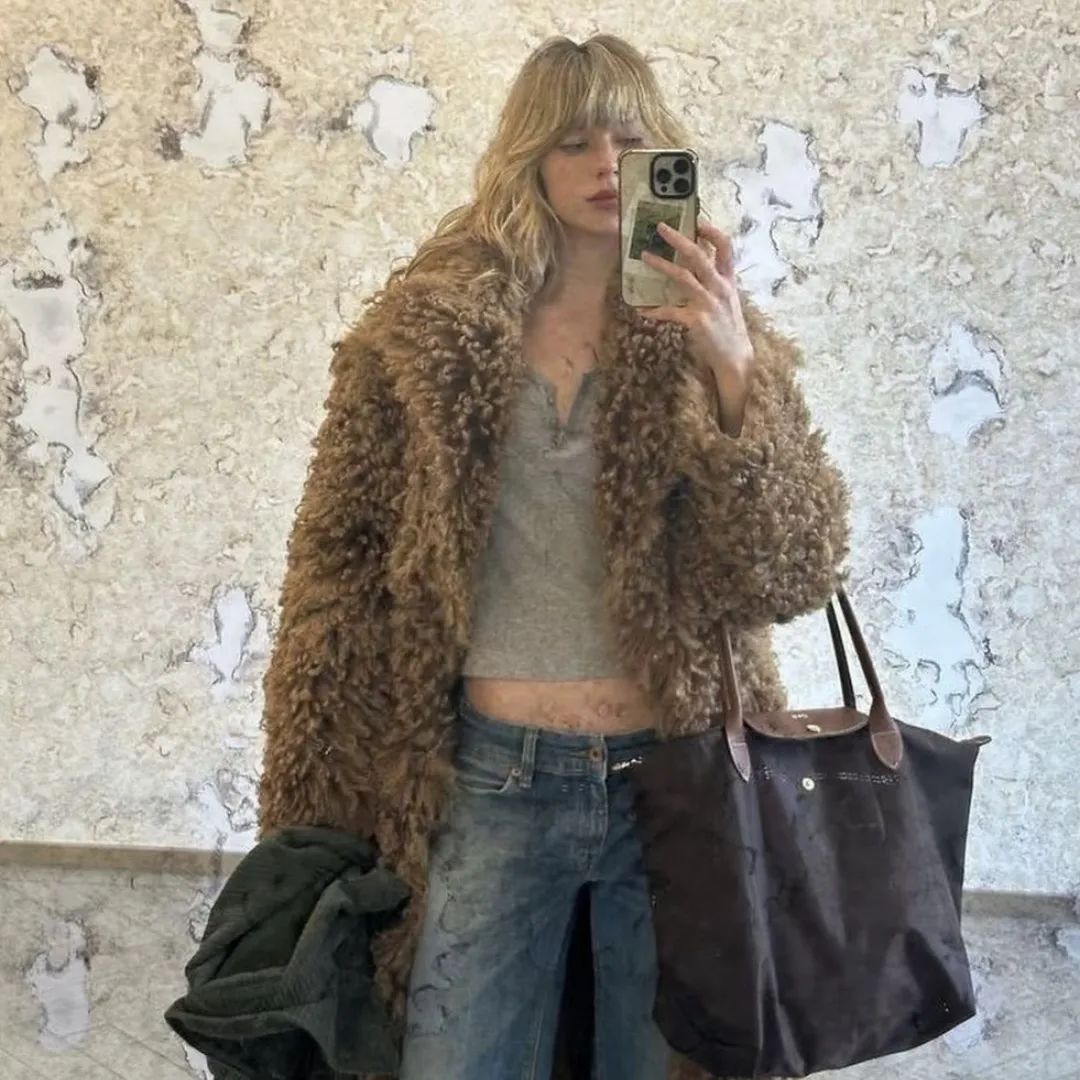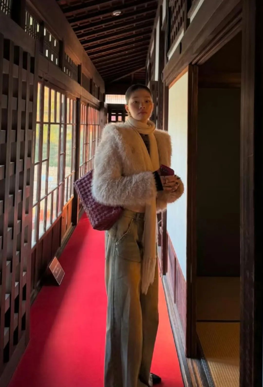 想在大合影中slay全场,可以试试用毛毛增加整个人的量感。中长款皮草搭配清爽的白色打底和直筒牛仔裤,人群中也有自带高光的效果。皮草的大量感已经足够撑起视觉重点,其他部分都可以适当弱化,简简单单的黑长直或利落的盘发都是不错的选择。