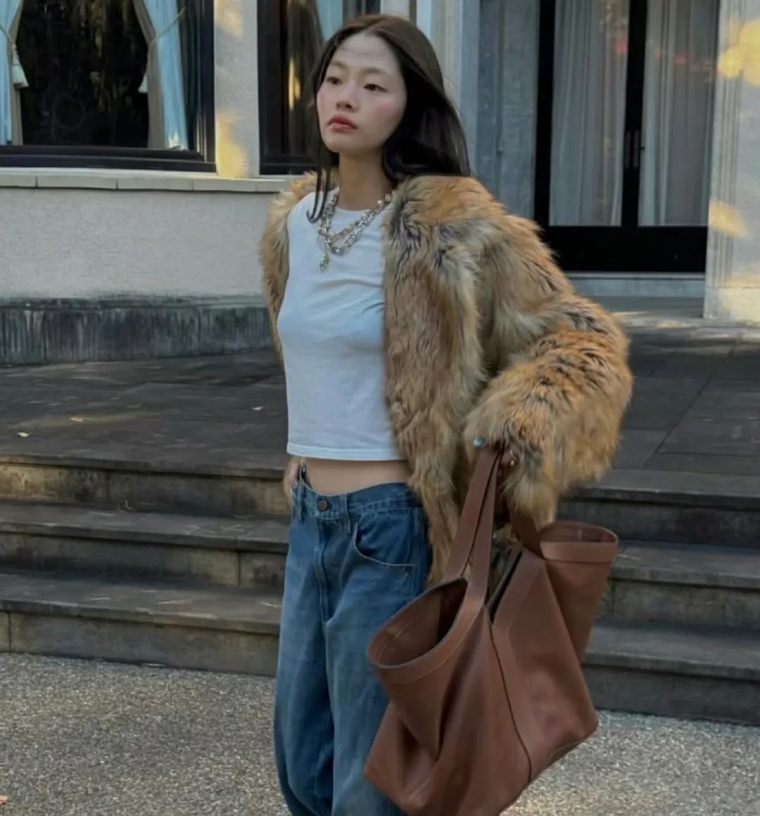 短款皮草外套搭配宽松牛仔裤的上短下长真的很修饰身材,搭配今年很火的线型窄围巾更纵向拉长比例。不仅打发了秋冬季的厚重感,也让整身更有线条感毛毛外套的诠释注入更加慵懒松弛的一面。