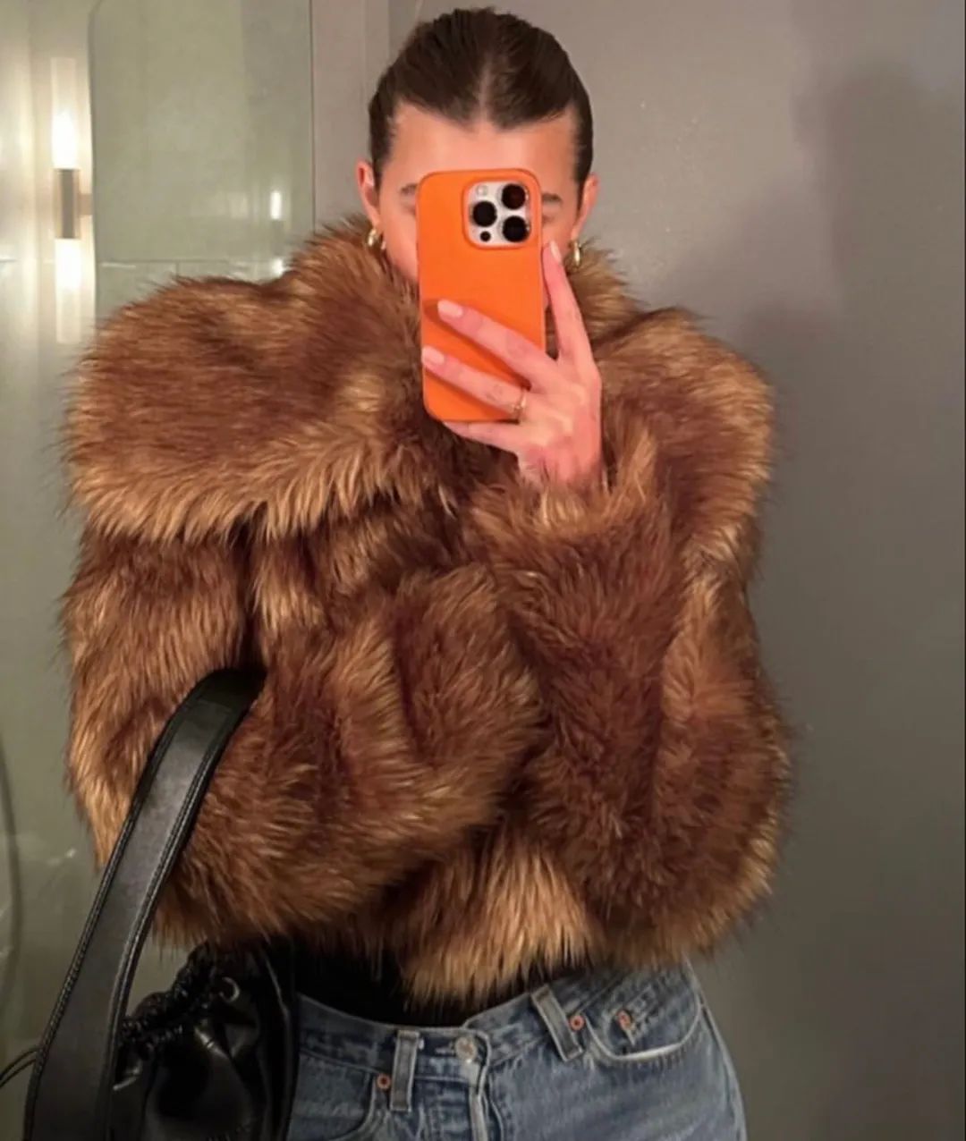 短款毛毛外套配短款打底衫再加上直筒牛仔裤,更是把腿拉伸到极致。怕冷星人不必露腰,用露出的一点点修身内搭来衔接上下两件宽松单品带来的膨胀感就足够。