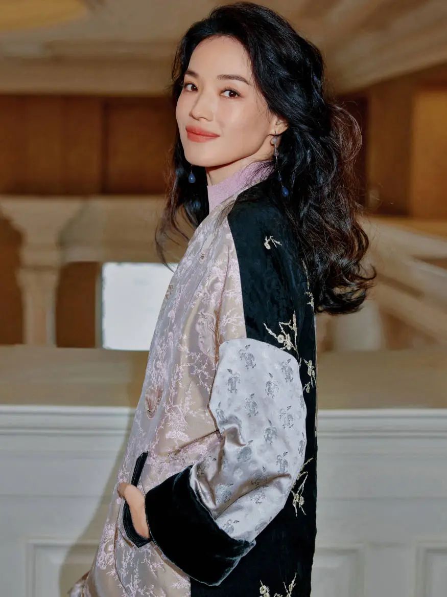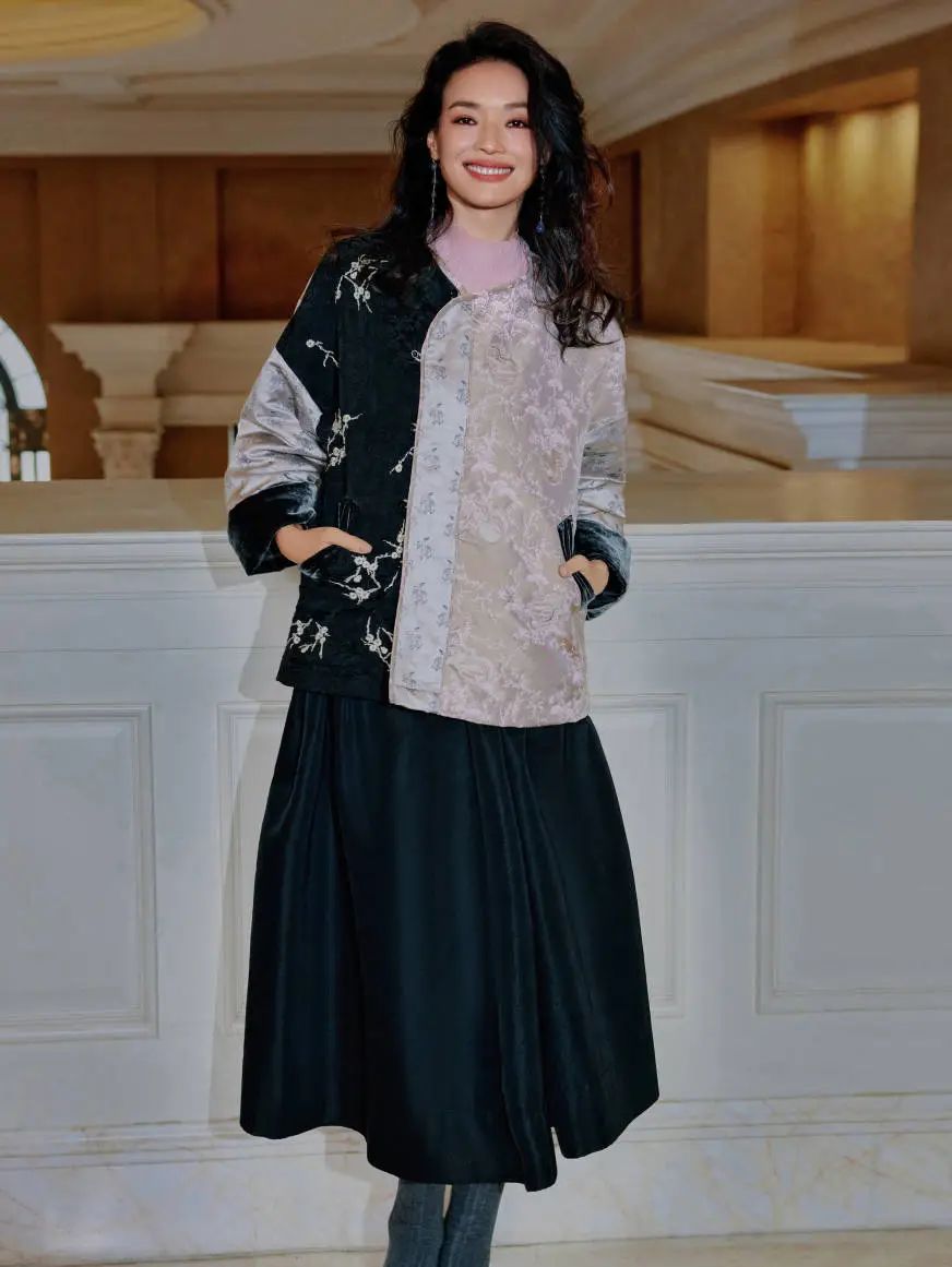 舒淇最近也颇爱新中式单品,比如这件拼色新中式外套,丝缎面料糅以不同的刺绣,极具细节感,搭配一条黑色半裙,非常优雅的一身。