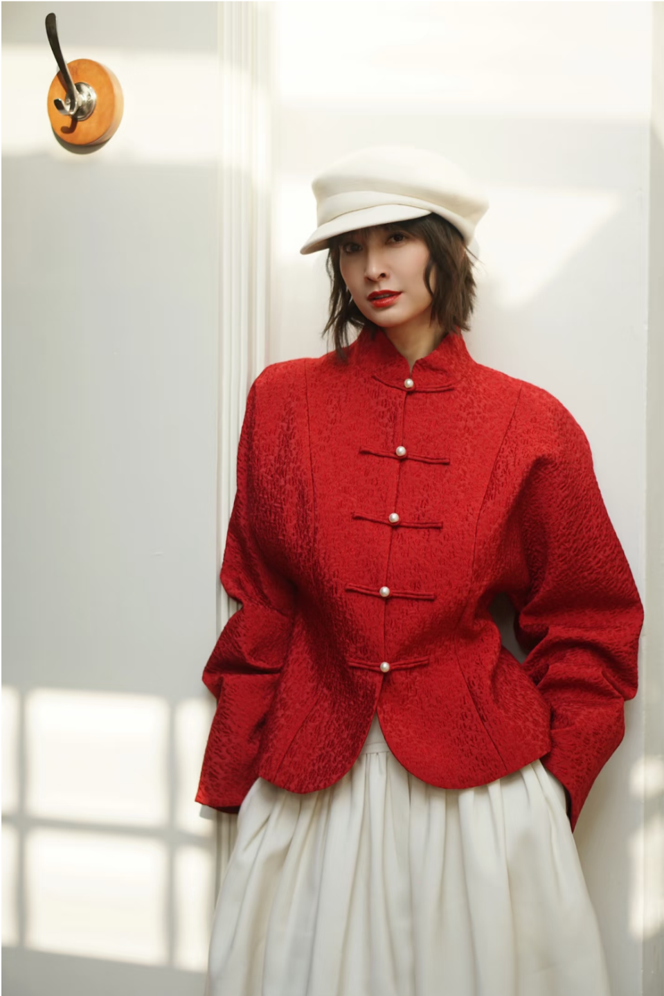 新年穿搭必不可少的红色单品,用工装夹克或剪裁在线的新中式外套,以利落的线条提升整体质感,避免土气。
