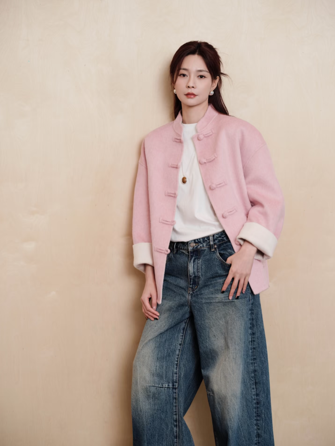 这件半高领的新中式上衣也非常耐看,柔和的色调和低调的暗纹设计,衬得整个人清丽温婉。