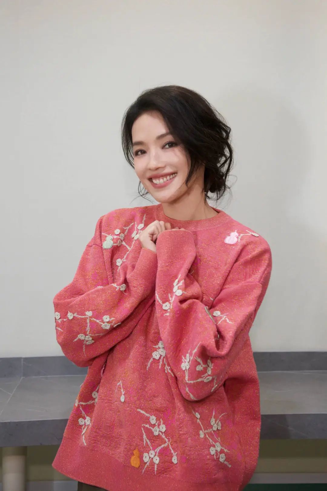 舒淇上身的这件粉调毛衣糅以中式提花,恰到好处呼应传统节日氛围,白色细节点睛又耐看!