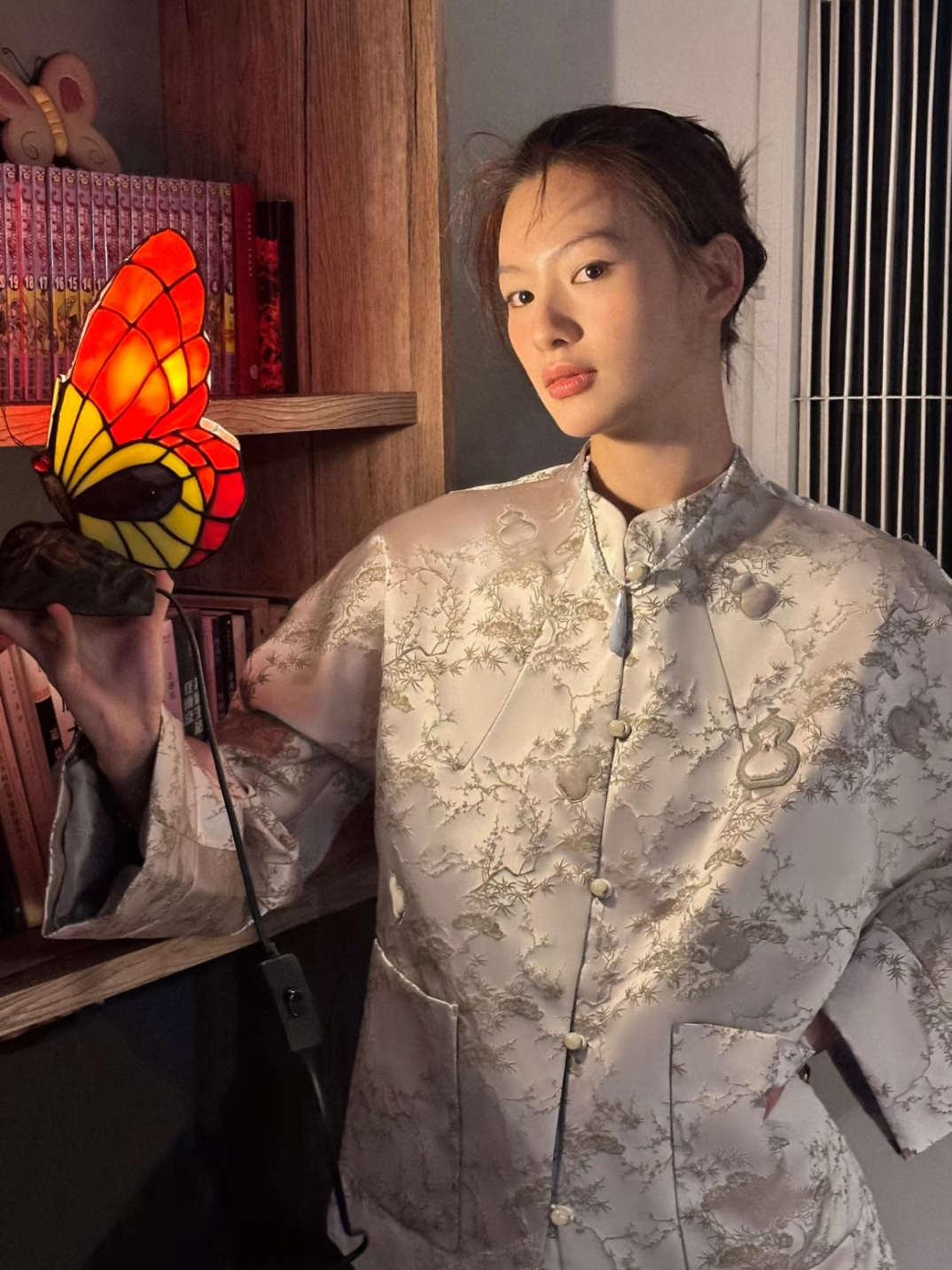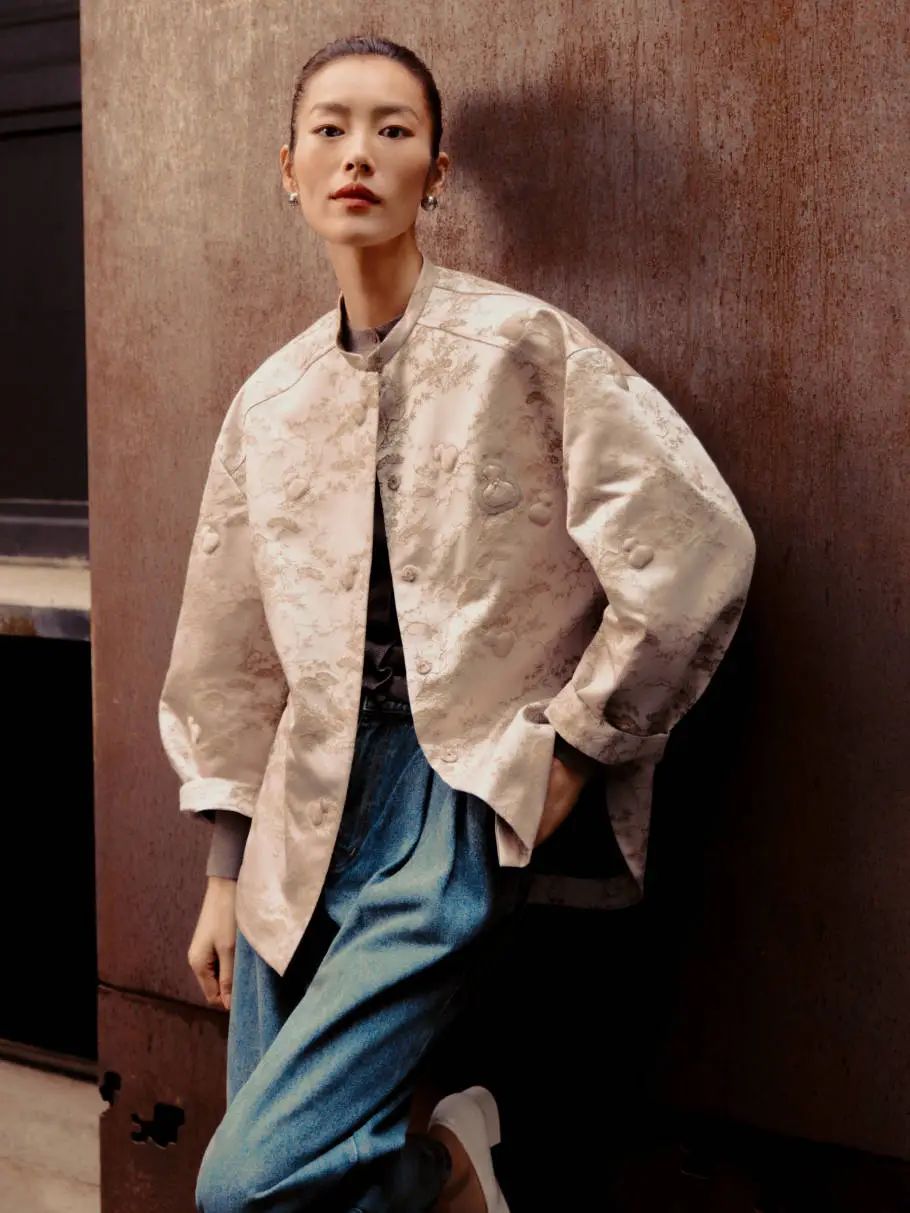 邱天、刘雯最近上身的新中式外套思路也比较一致,无论是衣领、袖子和袖口的设计都充满了巧思,不担心会撞款。既可以成套穿,拿捏东方美学;也可以混搭休闲下装(比如牛仔裤),把新中式穿出休闲感。