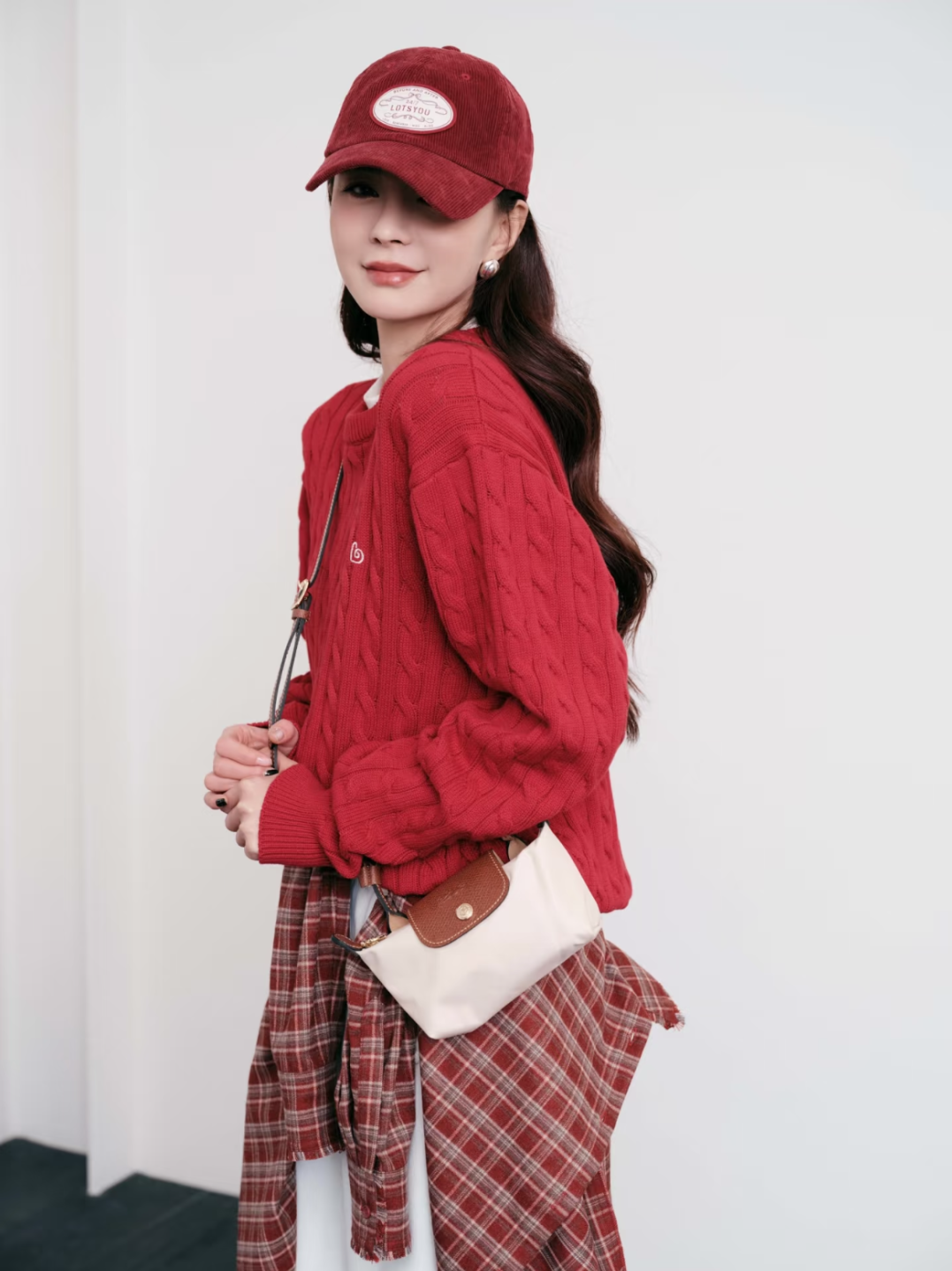 绞花毛衣搭配灯芯绒棒球帽、格纹衬衫,红元素以不同的面料和图案叠加,非常活力的女大既视感。