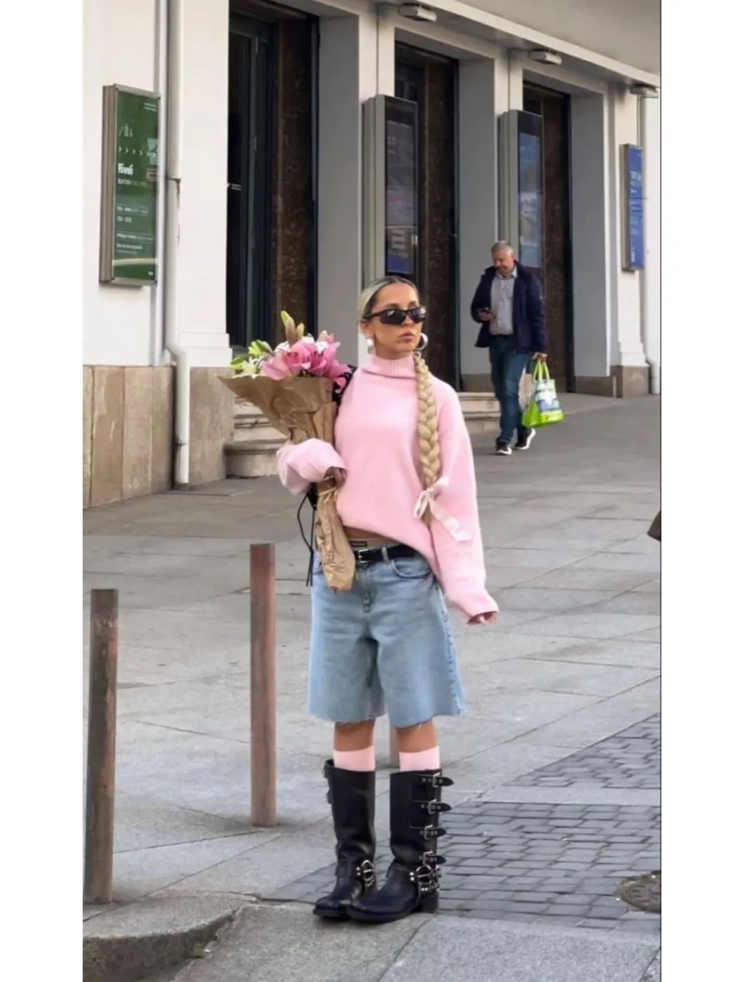 有了粉色小腿袜和高领毛衣的呼应,整身造型的颜色就更有呼应感和联结感。虽然上衣和裤装颜色都偏浅,但也不会觉得和黑色长筒靴太过割裂。