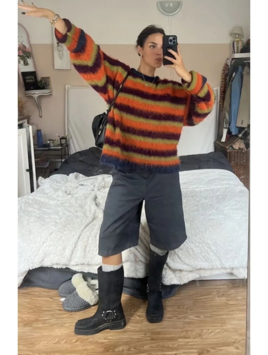 最近的博主们也很偏爱超阔腿中裤配长筒靴。中裤一定要选本身偏硬挺的材质,会穿在身上能形成自然的A型,不贴腿自然就能模糊腿部线条。