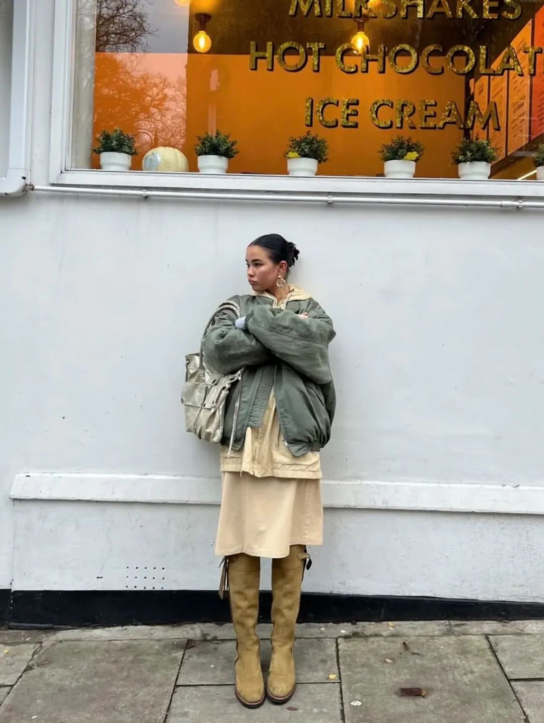 也可以直接选择和上衣裙装相近色的靴子,通过颜色加强整体延展效果。小A字裙裙摆藏起大腿的肉感,并且和上半身的廓形单品一起形成宽松感。与长筒靴“收”的形成对比,一下就会显得腿部纤细啦。