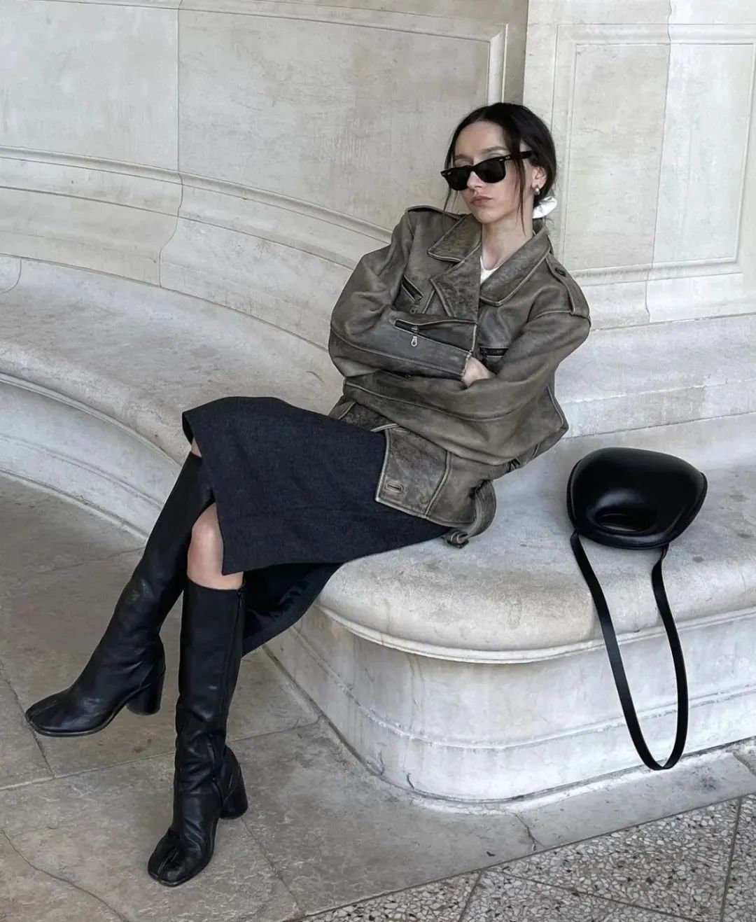 如果上半身已经选择了偏硬朗的皮衣或西装,但又不像显得攻击性过强,也可以选择皮质更软的单品,会显得气质更柔软。