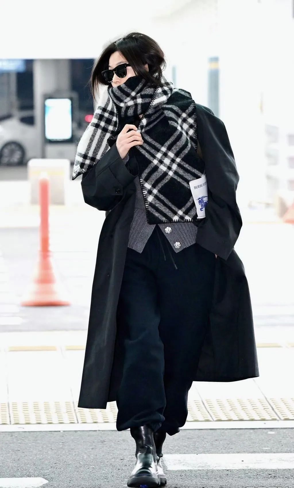 全智贤在机场的这一身穿搭也选择了黑色靴子搭配宽松长裤的组合,内收的长靴线条把大衣、围巾、宽松长裤的外扩效果进行内收,整体的“散”感减弱,整个人看着就利落精神了不少。