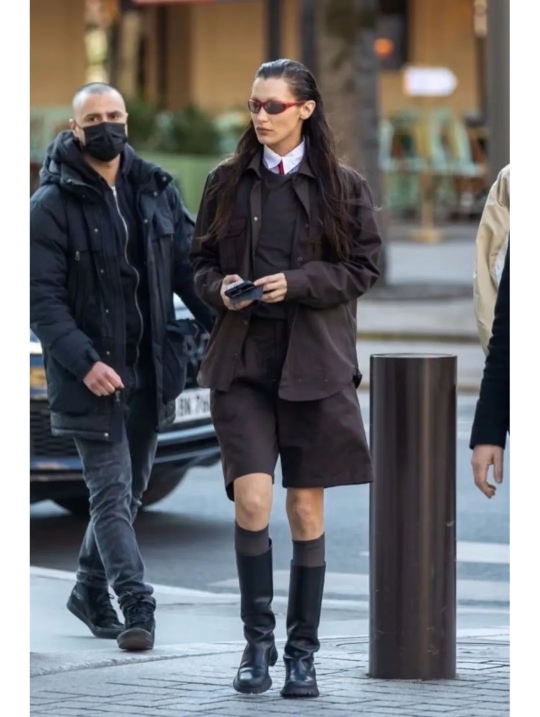 还可以根据穿搭的风格叠加一个小腿袜,不仅更保暖,视觉上也能起到延伸效果。如果遇到靴筒长度不够的问题,也能得到相应的解决。比如贝拉就选择了和穿搭颜色匹配的冷棕色,搭配中性感十足的小套装,复古又帅气。