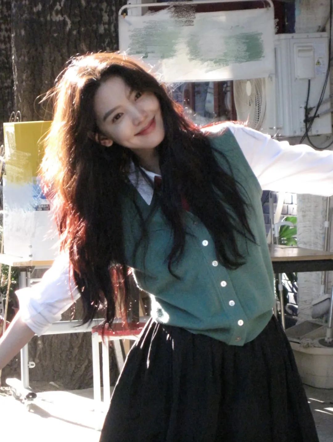 衣橱里的白衬衣一直存在但又不知道搭?选择一件合适的针织马甲就能解决这个问题。温柔的青绿色搭配白衬衣和长卷发,很有森女味道。