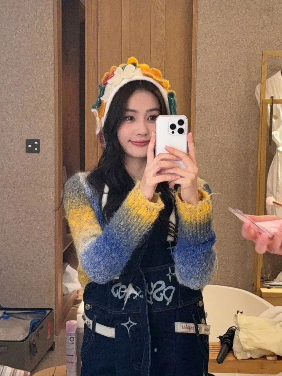 针织上衣和印花背带裤的搭配如果担心显得造型元素过多,可以像白鹿这样,背带裤、配饰的颜色都从针织中延展出来,弱化了复杂性,即便再加入一顶花朵帽子,也会感觉整体足够和谐、松弛。