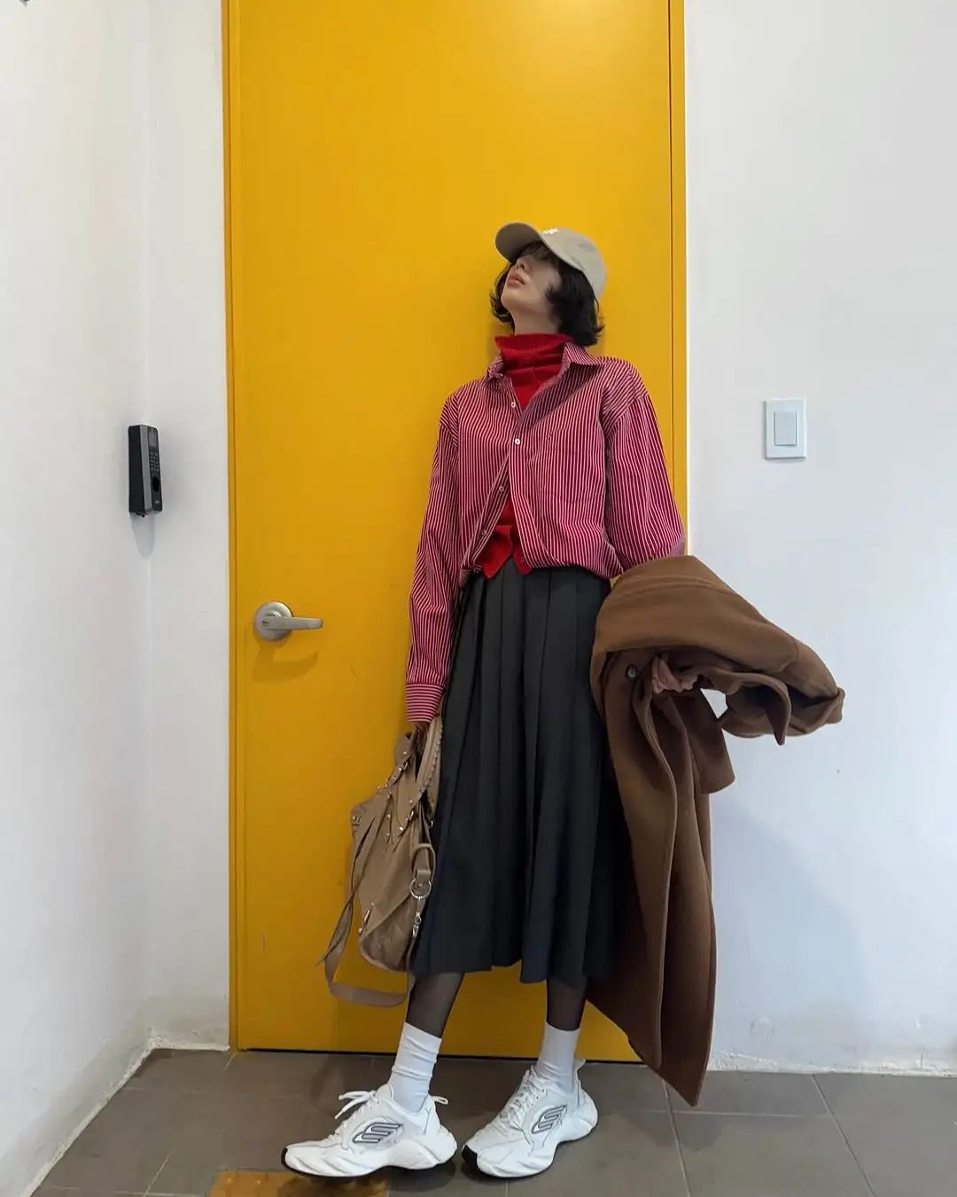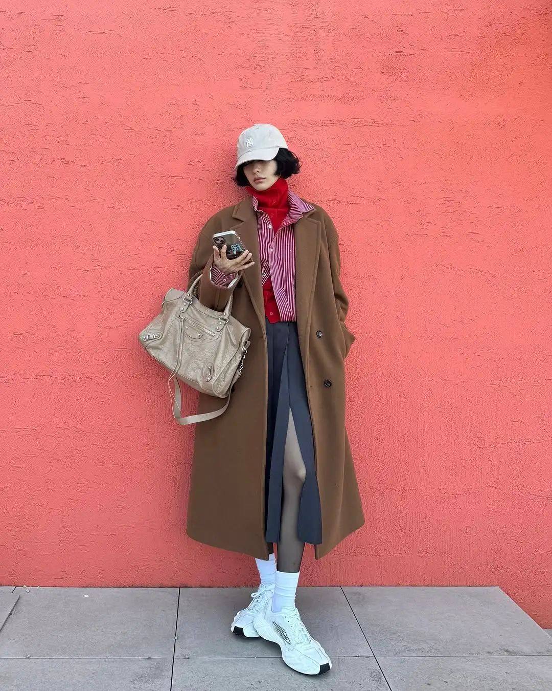 让穿衣Sense再进阶一步穿法,是将是选择和内搭同色系的衬衣,为原本很“平”的叠穿加入风格灵魂,下半身搭配半裙和休闲球鞋加入街头感,外层的长款外套则包裹住了这些时髦因子,为造型铺设基底,展现了扎实的穿搭功力。