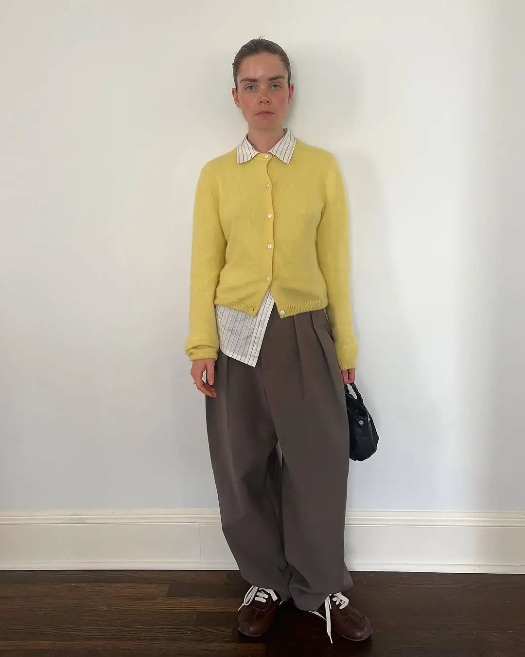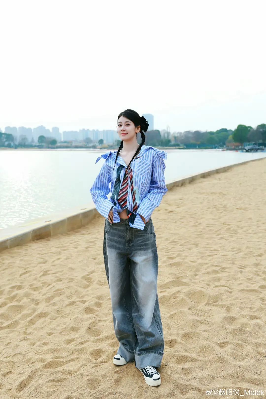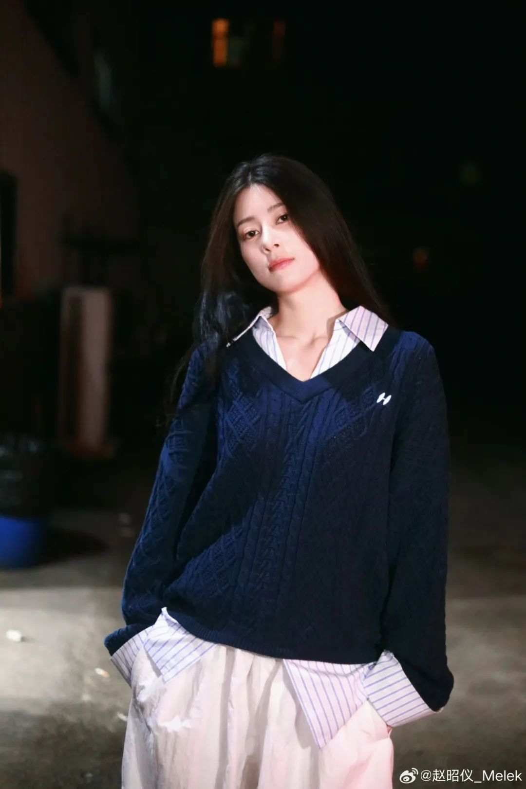 V领毛衣和衬衣所塑造的精英学院感造型,是不少时髦er都在用的衬衣叠穿法,不过板型、颜色的差异也能带来不同的时装语境。赵昭仪这身藏蓝色毛衣搭配浅色条纹衬衣是松弛感十足的“非正式学院风”,春天照着穿,基本不会出错。